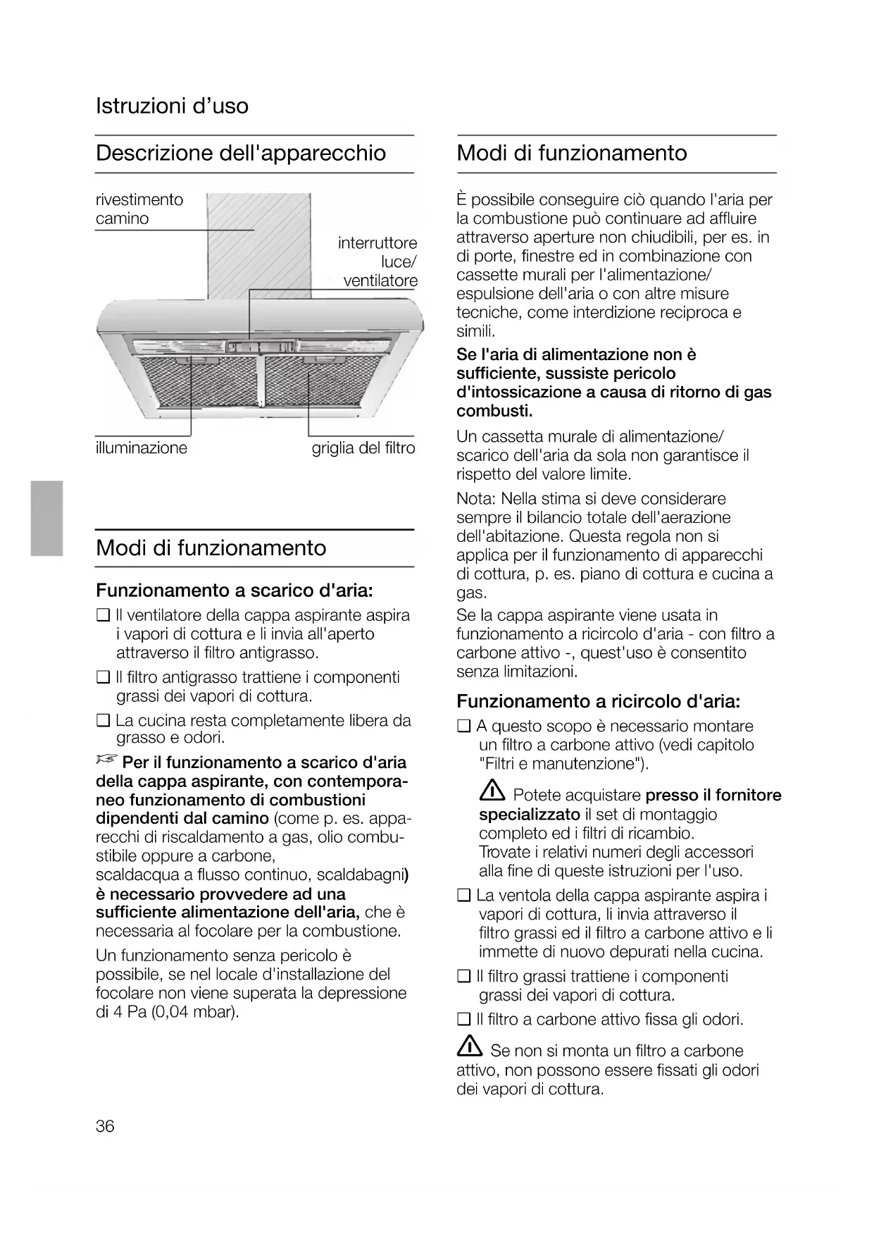gebruiksaanwijzing).36 Descrizione dell'apparecchio Modi di funzionamento Funzionamento a scarico d'aria: ❑ Il ventilatore della cappa aspirante aspira i vapori di cottura e li invia all'aperto attraverso il filtro antigrasso. ❑ Il filtro antigrasso trattiene i componenti grassi dei vapori di cottura. ❑ La cucina resta completamente libera da grasso e odori.