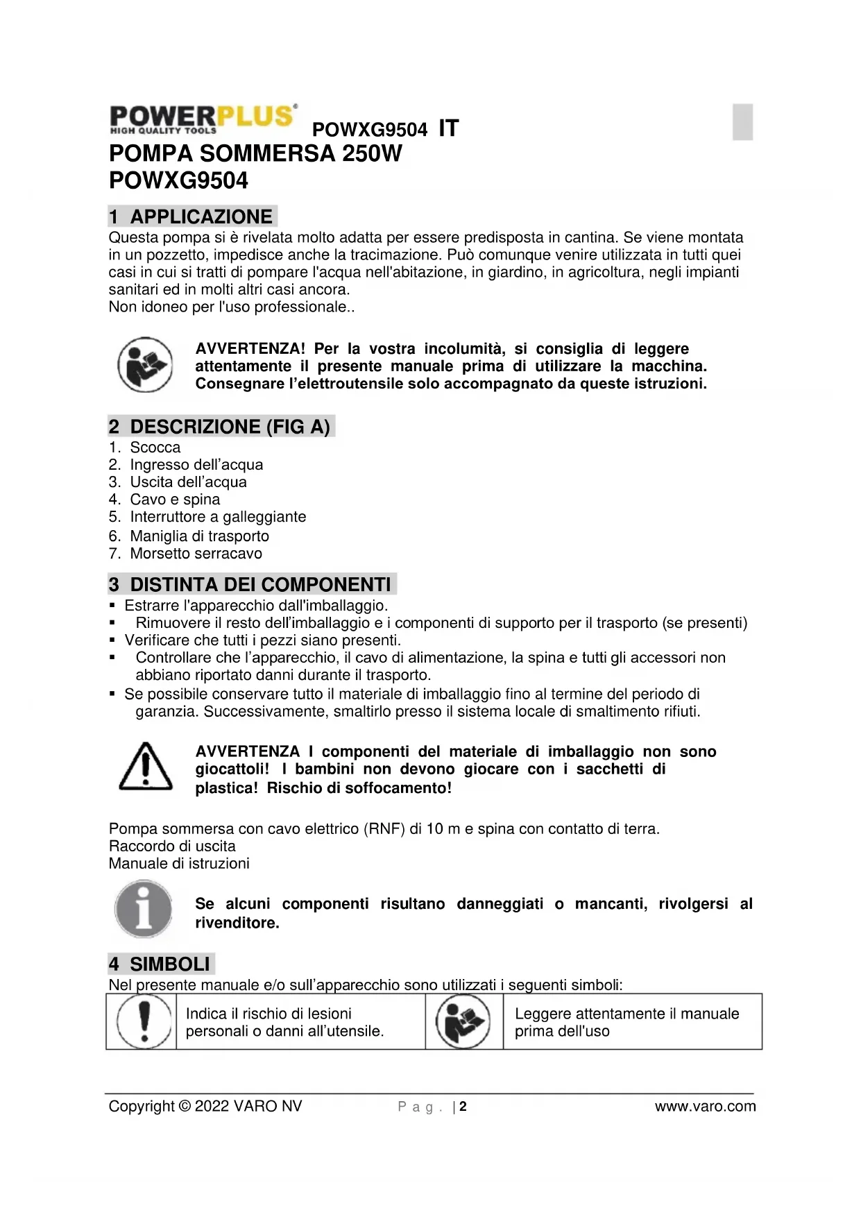 Leggere attentamente il manuale prima dell'usoPOWXG9504 IT Copyright © 2022 VARO NV P a g . | 3 www.varo.com