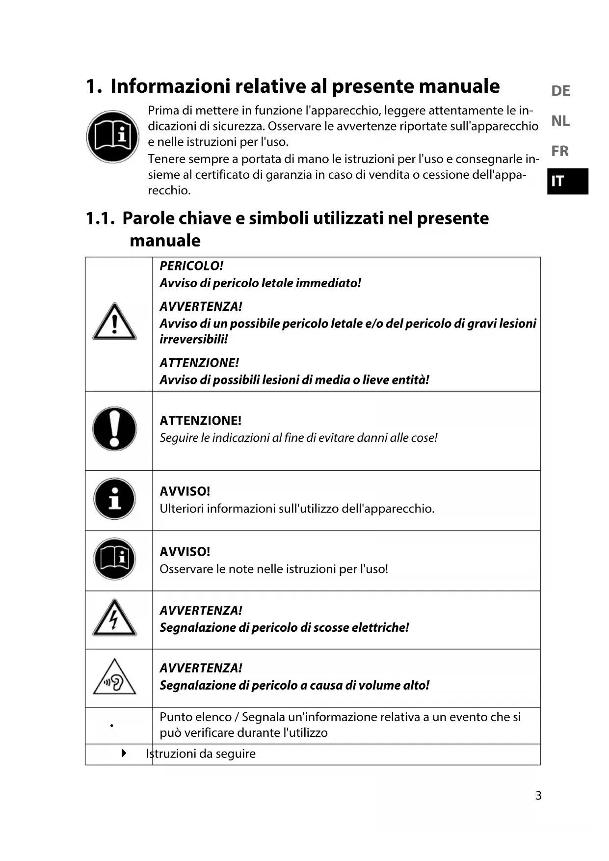 Prima di mettere in funzione l'apparecchio, leggere attentamente le in- dicazioni di sicurezza. Osservare le avvertenze riportate sull'apparecchio e nelle istruzioni per l'uso. Tenere sempre a portata di mano le istruzioni per l'uso e consegnarle in- sieme al certificato di garanzia in caso di vendita o cessione dell'appa- recchio. 1.1. Parole chiave e simboli utilizzati nel presente manuale PERICOLO! Avviso di pericolo letale immediato! AVVERTENZA! Avviso di un possibile pericolo letale e/o del pericolo di gravi lesioni irreversibili! ATTENZIONE! Avviso di possibili lesioni di media o lieve entità! ATTENZIONE! Seguire le indicazioni al fine di evitare danni alle cose! AVVISO! Ulteriori informazioni sull'utilizzo dell'apparecchio. AVVISO! Osservare le note nelle istruzioni per l'uso! AVVERTENZA! Segnalazione di pericolo di scosse elettriche! AVVERTENZA! Segnalazione di pericolo a causa di volume alto!