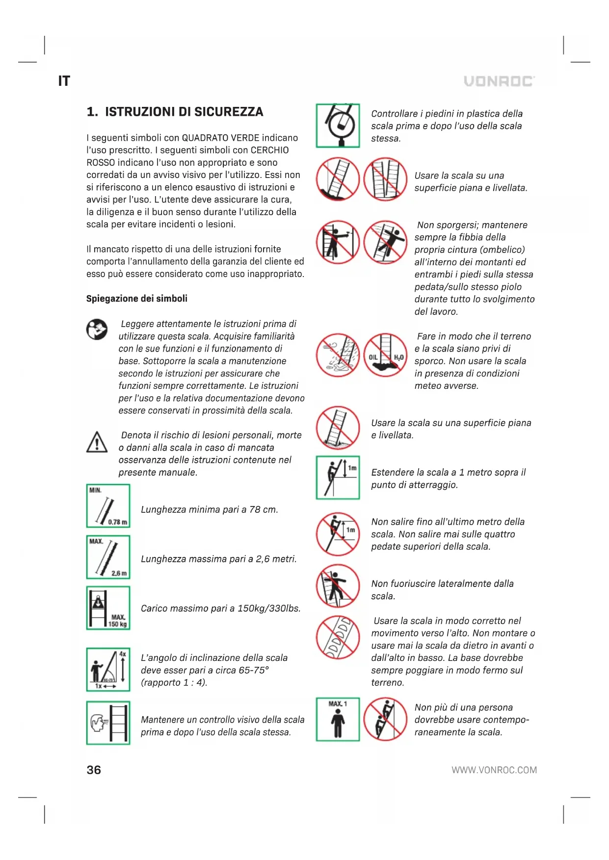 I seguenti simboli con QUADRATO VERDE indicano l’uso prescritto. I seguenti simboli con CERCHIO ROSSO indicano l’uso non appropriato e sono corredati da un avviso visivo per l’utilizzo. Essi non si riferiscono a un elenco esaustivo di istruzioni e avvisi per l’uso. L’utente deve assicurare la cura, la diligenza e il buon senso durante l’utilizzo della scala per evitare incidenti o lesioni. Il mancato rispetto di una delle istruzioni fornite comporta l’annullamento della garanzia del cliente ed esso può essere considerato come uso inappropriato. Spiegazione dei simboli Leggere attentamente le istruzioni prima di utilizzare questa scala. Acquisire familiarità con le sue funzioni e il funzionamento di base. Sottoporre la scala a manutenzione secondo le istruzioni per assicurare che funzioni sempre correttamente. Le istruzioni per l’uso e la relativa documentazione devono essere conservati in prossimità della scala. Denota il rischio di lesioni personali, morte o danni alla scala in caso di mancata osservanza delle istruzioni contenute nel presente manuale. Lunghezza minima pari a 78 cm. Lunghezza massima pari a 2,6 metri. Carico massimo pari a 150kg/330lbs. L’angolo di inclinazione della scala deve esser pari a circa 65-75° (rapporto 1 : 4). Mantenere un controllo visivo della scala prima e dopo l’uso della scala stessa. Controllare i piedini in plastica della scala prima e dopo l’uso della scala stessa. Usare la scala su una superficie piana e livellata. Non sporgersi; mantenere sempre la fibbia della propria cintura (ombelico) all’interno dei montanti ed entrambi i piedi sulla stessa pedata/sullo stesso piolo durante tutto lo svolgimento del lavoro. Fare in modo che il terreno e la scala siano privi di sporco. Non usare la scala in presenza di condizioni meteo avverse. Usare la scala su una superficie piana e livellata. Estendere la scala a 1 metro sopra il punto di atterraggio. Non salire fino all’ultimo metro della scala. Non salire mai sulle quattro pedate superiori della scala. Non fuoriuscire lateralmente dalla scala. Usare la scala in modo corretto nel movimento verso l’alto. Non montare o usare mai la scala da dietro in avanti o dall’alto in basso. La base dovrebbe sempre poggiare in modo fermo sul terreno. Non più di una persona dovrebbe usare contempo- raneamente la scala.IT