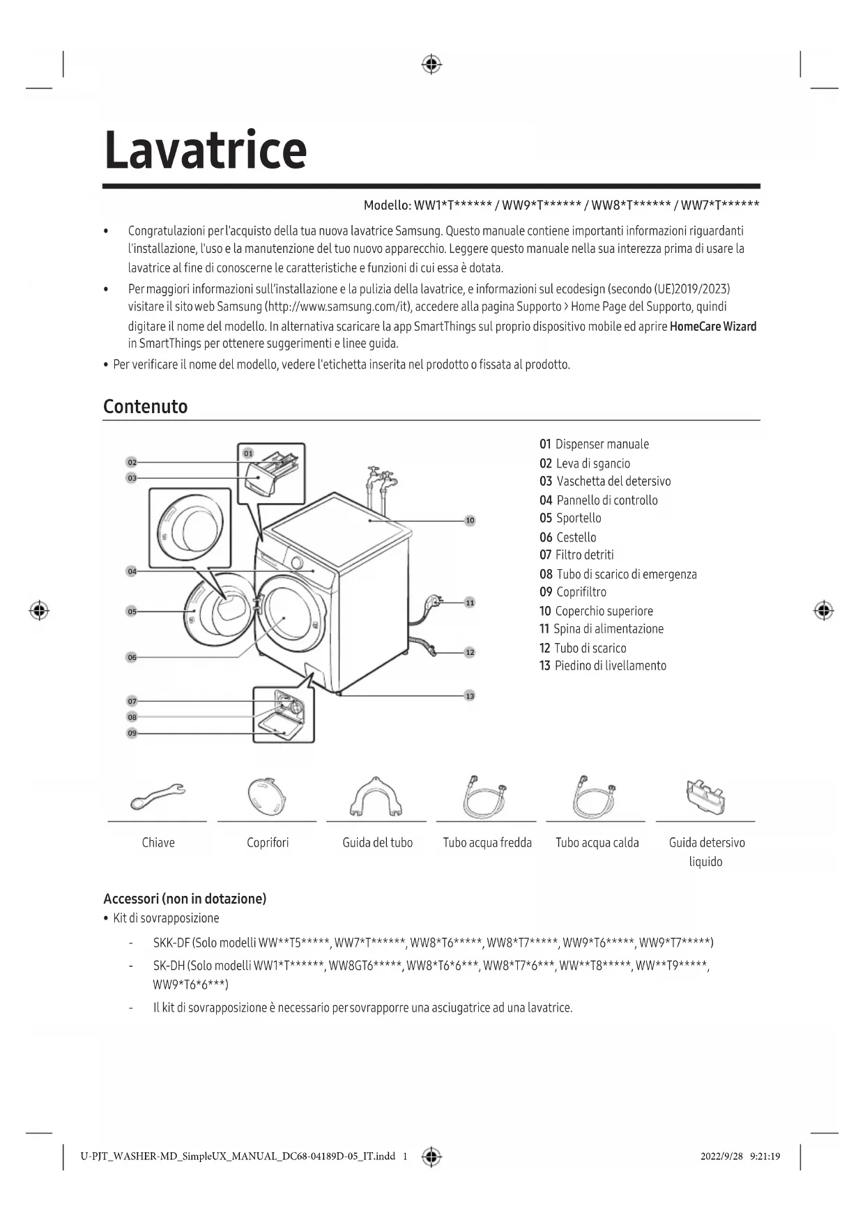 - Kit di sovrapposizione ‐ SKK-DF (Solo modelli WW**T5*****, WW7*T******, WW8*T6*****, WW8*T7*****, WW9*T6*****, WW9*T7*****) ‐ SK-DH (Solo modelli WW1*T******, WW8GT6*****, WW8*T6*6***, WW8*T7*6***, WW**T8*****, WW**T9*****, WW9*T6*6***) ‐ Il kit di sovrapposizione è necessario per sovrapporre una asciugatrice ad una lavatrice. U-PJT_WASHER-MD_SimpleUX_MANUAL_DC68-04189D-05_IT.indd 1 2022/9/28 9:21:19Italiano2 Informazioni di sicurezza NOTA