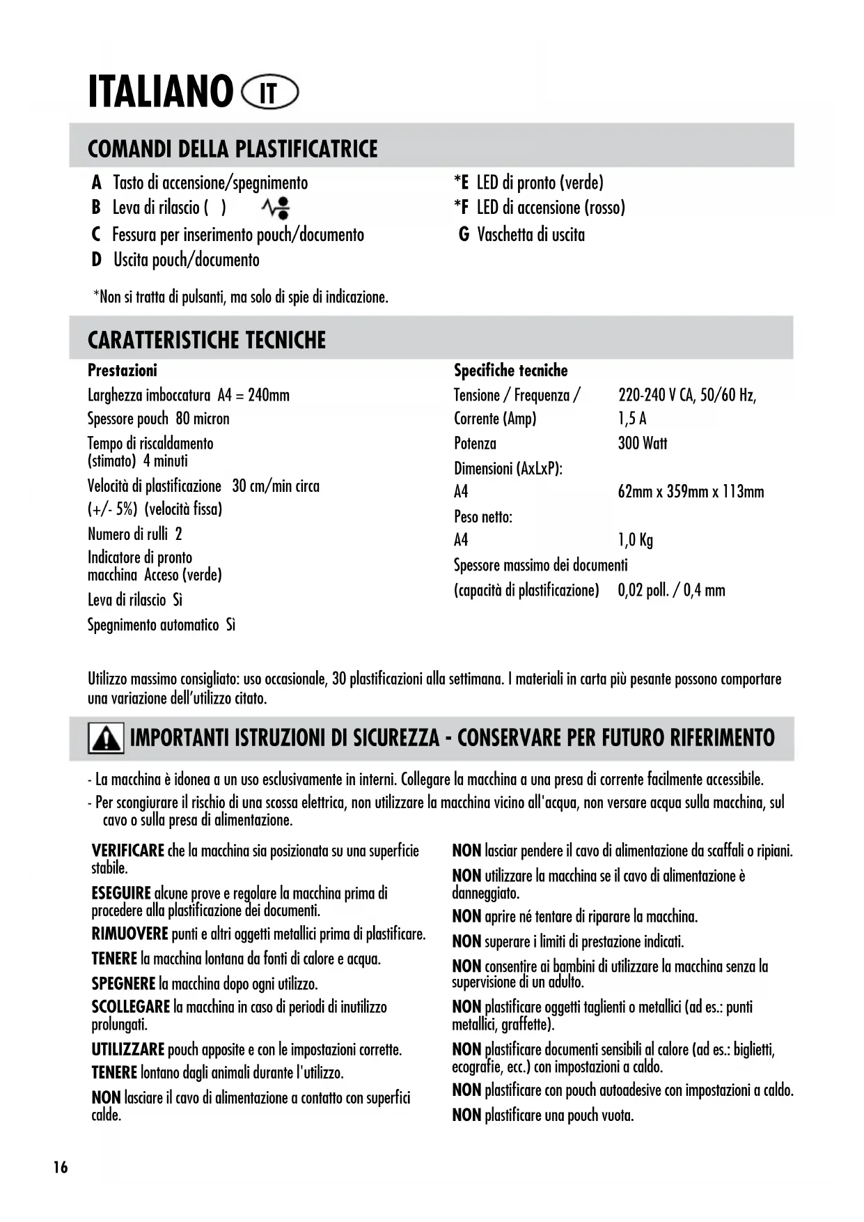 A Tasto di accensione/spegnimento B Leva di rilascio ( ) C Fessura per inserimento pouch/documento D Uscita pouch/documento *E LED di pronto (verde) *F LED di accensione (rosso) G Vaschetta di uscita CARATTERISTICHE TECNICHE Prestazioni Larghezza imboccatura A4 = 240mm Spessore pouch 80 micron Tempo di riscaldamento (stimato) 4 minuti Velocità di plastificazione 30 cm/min circa (+/- 5%) (velocità fissa) Numero di rulli 2 Indicatore di pronto macchina Acceso (verde) Leva di rilascio Sì Spegnimento automatico Sì Specifiche tecniche Tensione / Frequenza / 220-240 V CA, 50/60 Hz, Corrente (Amp) 1,5 A Potenza 300 Watt Dimensioni (AxLxP): A4 62mm x 359mm x 113mm Peso netto: A4 1,0 Kg Spessore massimo dei documenti (capacità di plastificazione) 0,02 poll. / 0,4 mm - La macchina è idonea a un uso esclusivamente in interni. Collegare la macchina a una presa di corrente facilmente accessibile. - Per scongiurare il rischio di una scossa elettrica, non utilizzare la macchina vicino all'acqua, non versare acqua sulla macchina, sul cavo o sulla presa di alimentazione. VERIFICARE che la macchina sia posizionata su una superficie stabile. ESEGUIRE alcune prove e regolare la macchina prima di procedere alla plastificazione dei documenti. RIMUOVERE punti e altri oggetti metallici prima di plastificare. TENERE la macchina lontana da fonti di calore e acqua. SPEGNERE la macchina dopo ogni utilizzo. SCOLLEGARE la macchina in caso di periodi di inutilizzo prolungati. UTILIZZARE pouch apposite e con le impostazioni corrette. TENERE lontano dagli animali durante l'utilizzo. NON lasciare il cavo di alimentazione a contatto con superfici calde. NON lasciar pendere il cavo di alimentazione da scaffali o ripiani. NON utilizzare la macchina se il cavo di alimentazione è danneggiato. NON aprire né tentare di riparare la macchina. NON superare i limiti di prestazione indicati. NON consentire ai bambini di utilizzare la macchina senza la supervisione di un adulto. NON plastificare oggetti taglienti o metallici (ad es.: punti metallici, graffette). NON plastificare documenti sensibili al calore (ad es.: biglietti, ecografie, ecc.) con impostazioni a caldo. NON plastificare con pouch autoadesive con impostazioni a caldo. NON plastificare una pouch vuota. ITALIANO