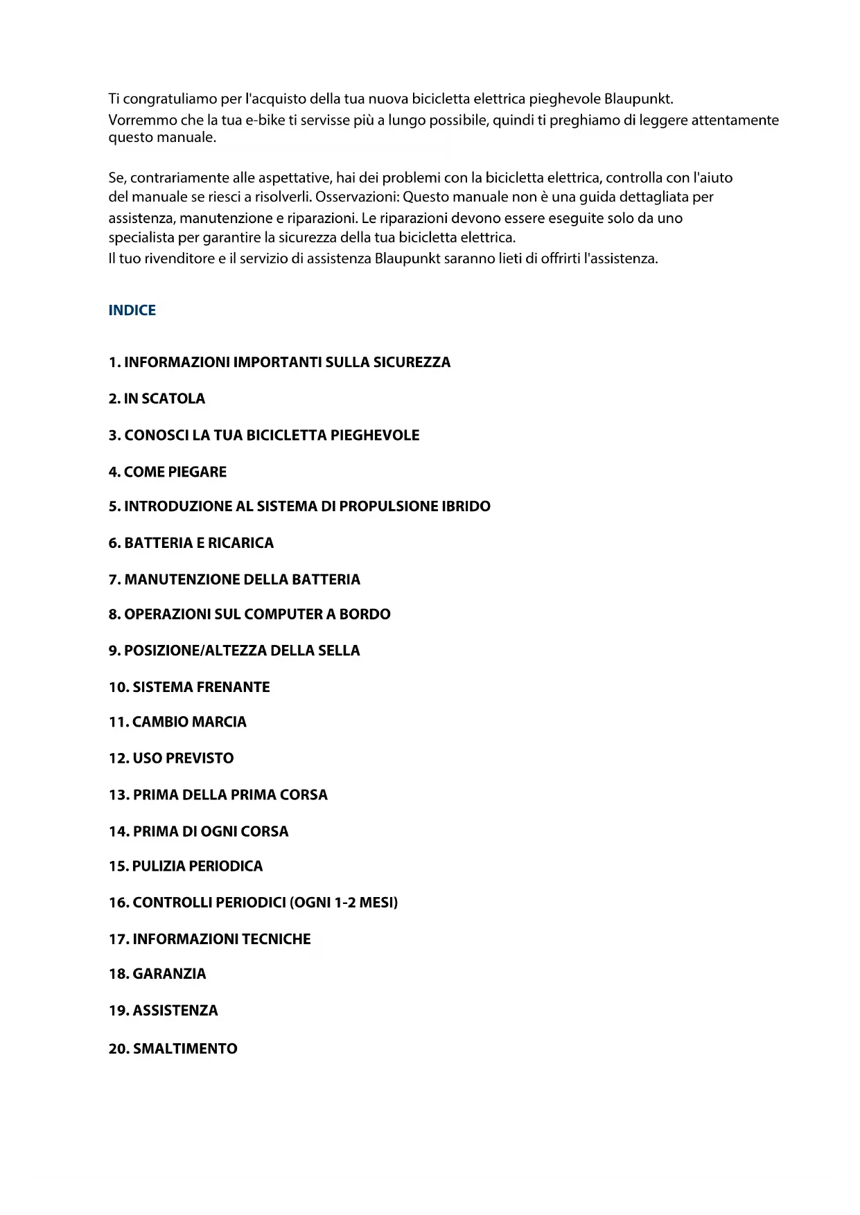 Sous réserve de modifications techniques !Ti congratuliamo per l'acquisto della tua nuova bicicletta elettrica pieghevole Blaupunkt. Vorremmo che la tua e-bike ti servisse più a lungo possibile, quindi ti preghiamo di leggere attentamente questo manuale. Se, contrariamente alle aspettative, hai dei problemi con la bicicletta elettrica, controlla con l'aiuto del manuale se riesci a risolverli. Osservazioni: Questo manuale non è una guida dettagliata per assistenza, manutenzione e riparazioni. Le riparazioni devono essere eseguite solo da uno specialista per garantire la sicurezza della tua bicicletta elettrica. Il tuo rivenditore e il servizio di assistenza Blaupunkt saranno lieti di offrirti l'assistenza.