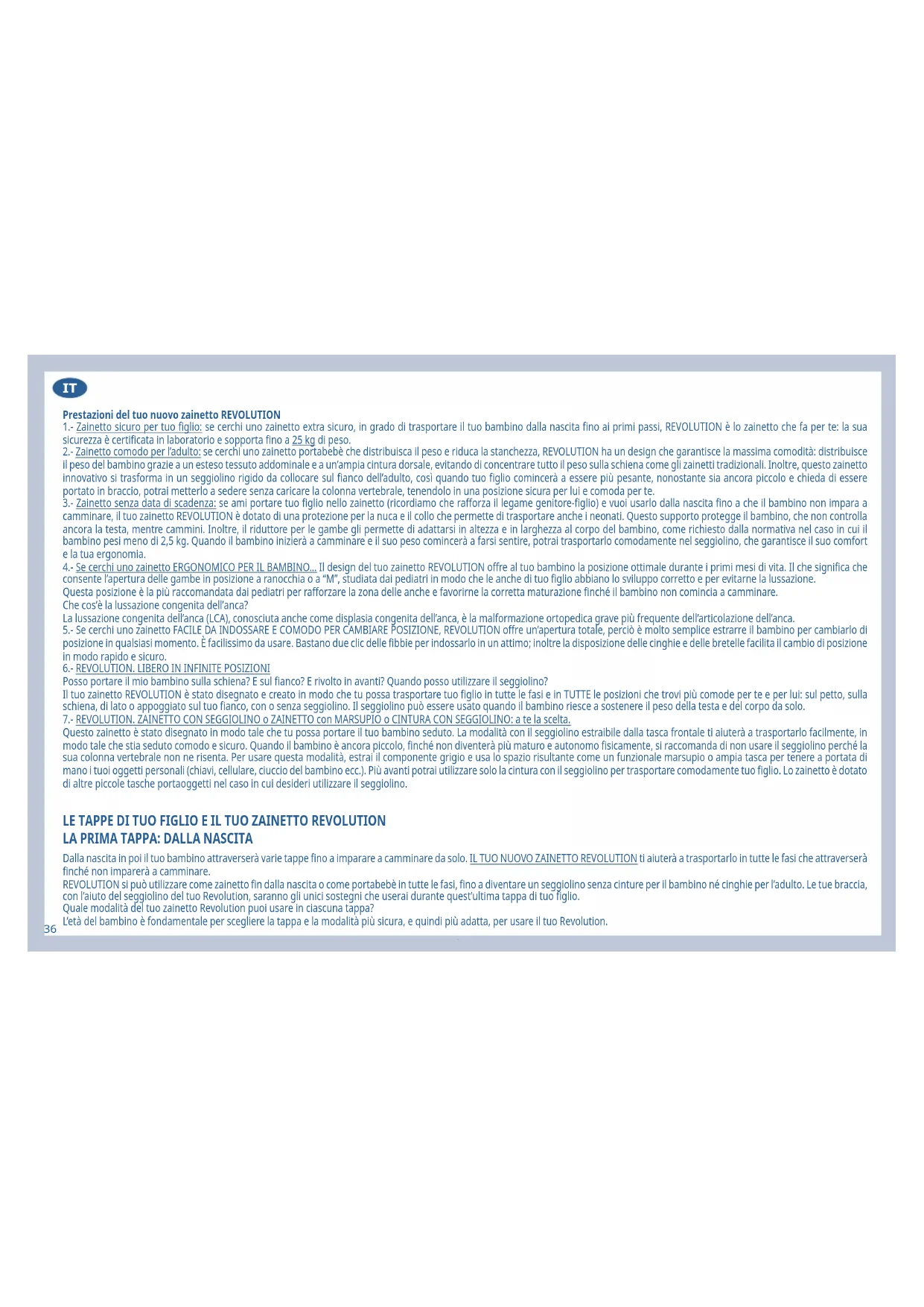 IT36 Prestazioni del tuo nuovo zainetto REVOLUTION 1.- Zainetto sicuro per tuo figlio: se cerchi uno zainetto extra sicuro, in grado di trasportare il tuo bambino dalla nascita fino ai primi passi, REVOLUTION è lo zainetto che fa per te: la sua sicurezza è certificata in laboratorio e sopporta fino a 25 kg di peso. 2.- Zainetto comodo per l’adulto: se cerchi uno zainetto portabebè che distribuisca il peso e riduca la stanchezza, REVOLUTION ha un design che garantisce la massima comodità: distribuisce il peso del bambino grazie a un esteso tessuto addominale e a un’ampia cintura dorsale, evitando di concentrare tutto il peso sulla schiena come gli zainetti tradizionali. Inoltre, questo zainetto innovativo si trasforma in un seggiolino rigido da collocare sul fianco dell’adulto, così quando tuo figlio comincerà a essere più pesante, nonostante sia ancora piccolo e chieda di essere portato in braccio, potrai metterlo a sedere senza caricare la colonna vertebrale, tenendolo in una posizione sicura per lui e comoda per te. 3.- Zainetto senza data di scadenza: se ami portare tuo figlio nello zainetto (ricordiamo che rafforza il legame genitore-figlio) e vuoi usarlo dalla nascita fino a che il bambino non impara a camminare, il tuo zainetto REVOLUTION è dotato di una protezione per la nuca e il collo che permette di trasportare anche i neonati. Questo supporto protegge il bambino, che non controlla ancora la testa, mentre cammini. Inoltre, il riduttore per le gambe gli permette di adattarsi in altezza e in larghezza al corpo del bambino, come richiesto dalla normativa nel caso in cui il bambino pesi meno di 2,5 kg. Quando il bambino inizierà a camminare e il suo peso comincerà a farsi sentire, potrai trasportarlo comodamente nel seggiolino, che garantisce il suo comfort e la tua ergonomia. 4.- Se cerchi uno zainetto ERGONOMICO PER IL BAMBINO… Il design del tuo zainetto REVOLUTION offre al tuo bambino la posizione ottimale durante i primi mesi di vita. Il che significa che consente l’apertura delle gambe in posizione a ranocchia o a “M”, studiata dai pediatri in modo che le anche di tuo figlio abbiano lo sviluppo corretto e per evitarne la lussazione. Questa posizione è la più raccomandata dai pediatri per rafforzare la zona delle anche e favorirne la corretta maturazione finché il bambino non comincia a camminare. Che cos’è la lussazione congenita dell’anca? La lussazione congenita dell’anca (LCA), conosciuta anche come displasia congenita dell’anca, è la malformazione ortopedica grave più frequente dell’articolazione dell’anca. 5.- Se cerchi uno zainetto FACILE DA INDOSSARE E COMODO PER CAMBIARE POSIZIONE, REVOLUTION offre un’apertura totale, perciò è molto semplice estrarre il bambino per cambiarlo di posizione in qualsiasi momento. È facilissimo da usare. Bastano due clic delle fibbie per indossarlo in un attimo; inoltre la disposizione delle cinghie e delle bretelle facilita il cambio di posizione in modo rapido e sicuro.