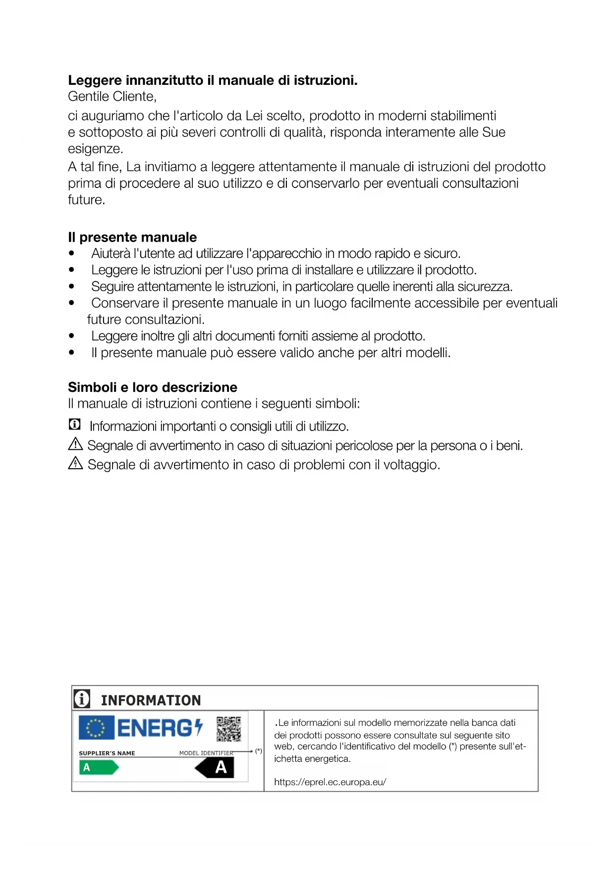 DISCLAIMER / AVVERTENZE Alcuni guasti (semplici) possono essere adeguatamente gestiti dall'utente finale senza che sorgano problemi di sicurezza o utilizzi non sicuri, a condizione che vengano eseguiti entro i limiti e in conformità con le seguenti istruzioni (vedere la sezione "Riparazione fai da te"). Pertanto, salvo diversa autorizzazione nella sezione di seguito "Riparazione fai da te", le riparazioni devono essere indirizzate a manutentori professionisti registrati al fine di evitare problemi di sicurezza. Un manutentore professionista registrato è un manutentore professionista a cui è stato concesso l'accesso alle istruzioni e all'elenco dei pezzi di ricambio di questo prodotto dal produttore secondo le modalità descritte negli atti legislativi ai sensi della Direttiva 2009/125/CE. Tuttavia, solo l'agente dell'assistenza (ovvero i manutentori professionisti autorizzati) che è possibile contattare tramite il numero di telefono indicato nel manuale dell'utente / scheda di garanzia o tramite il rivenditore autorizzato che può fornire assistenza in base ai termini di garanzia. Pertanto, si prega di notare che le riparazioni da parte di manutentori professionisti (non autorizzati da Beko) invaliderà la garanzia. Riparazione fai da te La riparazione fai da te può essere eseguita dall'utente finale per quanto riguarda i seguenti pezzi di ricambio: maniglie delle porte, cerniere delle porte, vassoi, cestelli e guarnizioni delle porte (un elenco aggiornato è disponibile anche su support.beko.com dal 1° marzo 2021) Inoltre, per garantire la sicurezza del prodotto e per prevenire il rischio di lesioni gravi, la suddetta riparazione fai da te deve essere eseguita seguendo le istruzioni nel manuale utente per la riparazione fai da te o disponibili in support. beko.com Per la propria sicurezza, scollegare il prodotto prima di tentare qualsiasi riparazione fai da te. Tentativi di riparazione e riparazione da parte degli utenti finali per parti non incluse in tale elenco e/o che non seguono le istruzioni nei manuali utente per la riparazione fai da te o che sono disponibili in support.beko.com, potrebbe dar luogo a problemi di sicurezza non imputabili a Beko e invaliderà la garanzia del prodotto.IT