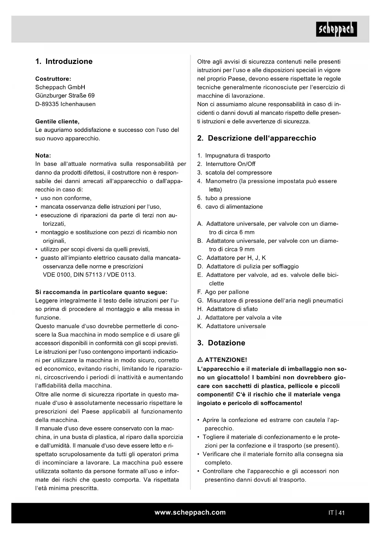 Costruttore: Scheppach GmbH Günzburger Straße 69 D-89335 Ichenhausen Gentile cliente, Le auguriamo soddisfazione e successo con l‘uso del suo nuovo apparecchio. Nota: In base all‘attuale normativa sulla responsabilità per danno da prodotti difettosi, il costruttore non è respon- sabile dei danni arrecati all‘apparecchio o dall‘appa- recchio in caso di: