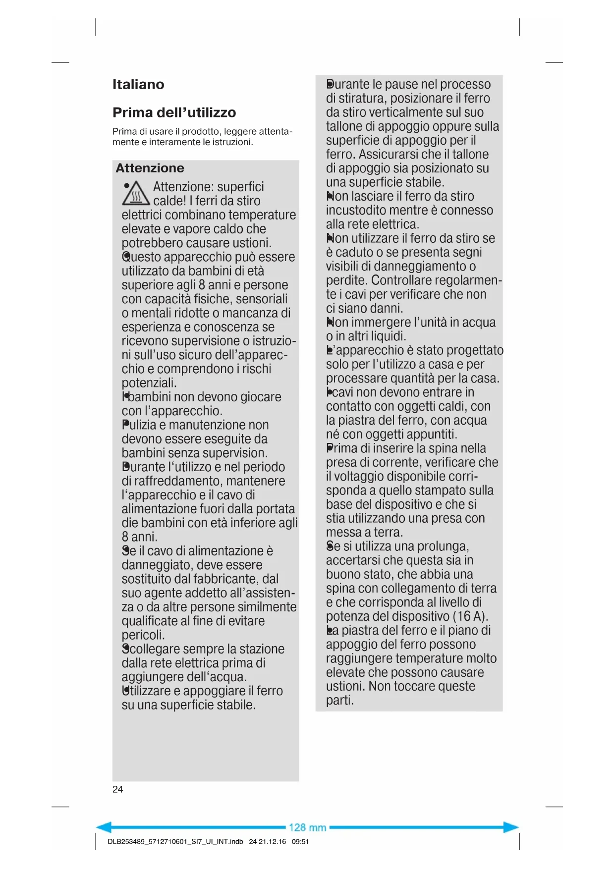 DLB253489_5712710601_SI7_UI_INT.indb 23 21.12.16 09:51Italiano Prima dell’utilizzo Prima di usare il prodotto, leggere attenta- mente e interamente le istruzioni. Attenzione