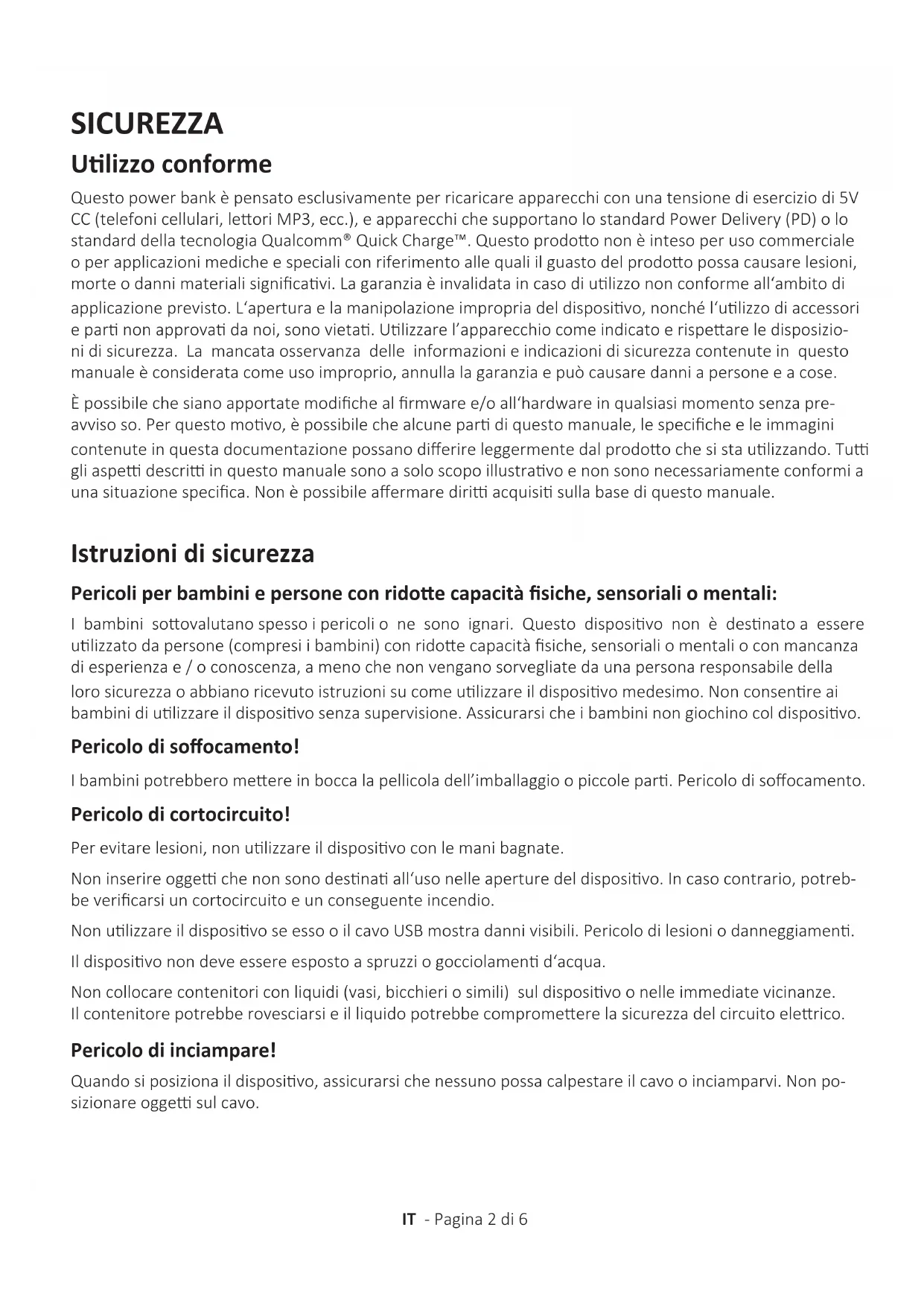 Ulizzare l‘unità da 0 a 35 gradi Celsius e a un‘umidità massima dell 85% (per un breve periodo). In caso di inulizzo prolungato del disposivo, conservare tra -10 e 45 gradi Celsius con umidità relava massima del 90% (per un breve periodo) e caricare ogni tre mesi per oenere prestazioni omali. DATI TECNICI IT - Pagina 6 di 6 Dimensioni: 95 x 63,5 x 24,5 mm Consumo di corrente (ingresso): USB-C In: Normale: 5V-3A Power Delivery: 5V- 3A, 9V- 2.22A, 12V- 1.67A (max. 20 wa) Corrente di carica (uscita): USB-A Out: Normale: 5V- 3A Quick Charge: 5V- 3A, 9V- 2A, 12V- 1.5A (max. 18 wa) USB-C Out: Normale: 5V- 3A Power Delivery: 5V- 3A, 9V- 2.22A, 12V- 1.67A (max. 20 wa) USB-A + USB-C Out: 5V- 3A totale Baeria interna: 10.000 mAh / 3.7 V baeria poli- mero di lio Display di stato: 4 LED Protezione da sovraccarico / protezione da scarica / protezione da sovratensione / protezione da cortocircuito integrate:
