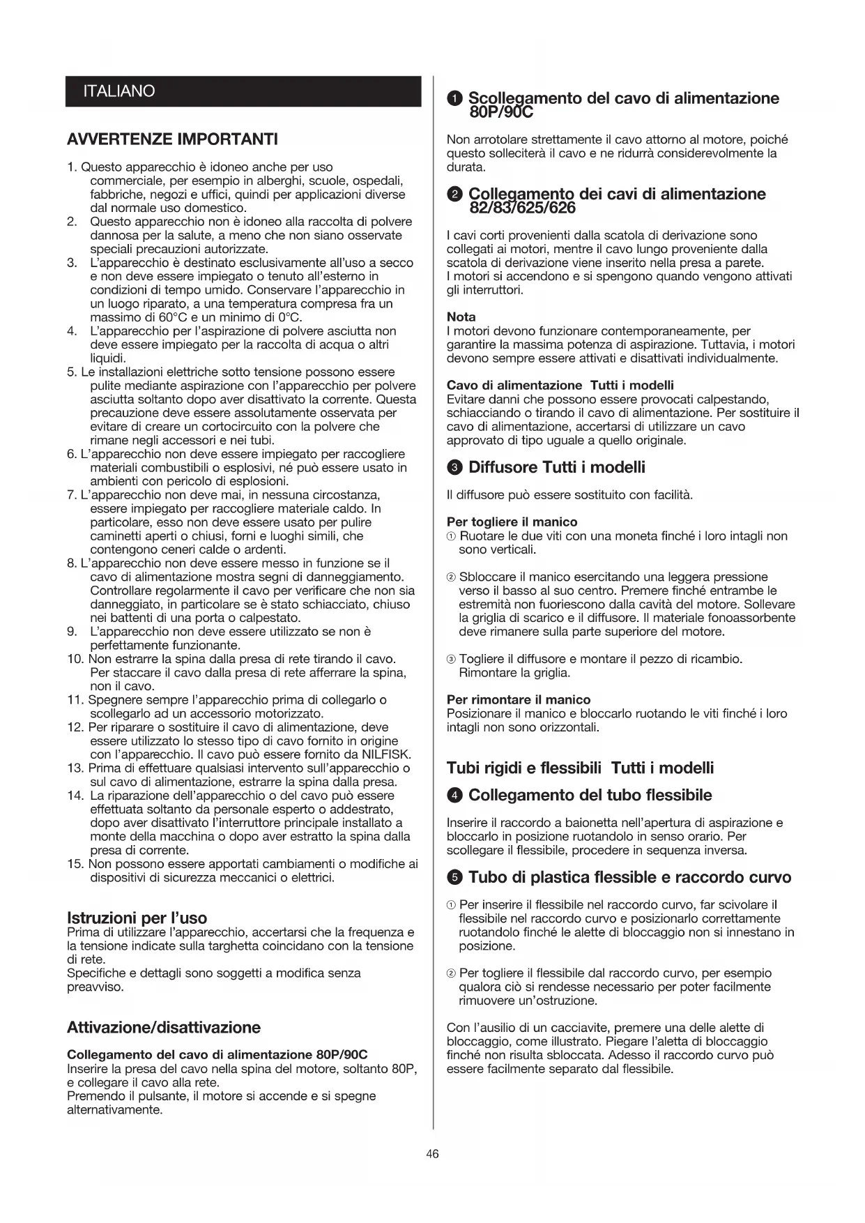 dispositivi di sicurezza meccanici o elettrici. Istruzioni per l’uso Prima di utilizzare l’apparecchio, accertarsi che la frequenza e la tensione indicate sulla targhetta coincidano con la tensione di rete. Specifiche e dettagli sono soggetti a modifica senza preavviso. Attivazione/disattivazione Collegamento del cavo di alimentazione 80P/90C Inserire la presa del cavo nella spina del motore, soltanto 80P, e collegare il cavo alla rete. Premendo il pulsante, il motore si accende e si spegne alternativamente. Q Scollegamento del cavo di alimentazione 80P/90C Non arrotolare strettamente il cavo attorno al motore, poiché questo solleciterà il cavo e ne ridurrà considerevolmente la durata. W Collegamento dei cavi di alimentazione 82/83/625/626 I cavi corti provenienti dalla scatola di derivazione sono collegati ai motori, mentre il cavo lungo proveniente dalla scatola di derivazione viene inserito nella presa a parete. I motori si accendono e si spengono quando vengono attivati gli interruttori. Nota I motori devono funzionare contemporaneamente, per garantire la massima potenza di aspirazione. Tuttavia, i motori devono sempre essere attivati e disattivati individualmente. Cavo di alimentazione Tutti i modelli Evitare danni che possono essere provocati calpestando, schiacciando o tirando il cavo di alimentazione. Per sostituire il cavo di alimentazione, accertarsi di utilizzare un cavo approvato di tipo uguale a quello originale. E Diffusore Tutti i modelli Il diffusore può essere sostituito con facilità. Per togliere il manico ! Ruotare le due viti con una moneta finché i loro intagli non sono verticali. @ Sbloccare il manico esercitando una leggera pressione verso il basso al suo centro. Premere finché entrambe le estremità non fuoriescono dalla cavità del motore. Sollevare la griglia di scarico e il diffusore. Il materiale fonoassorbente deve rimanere sulla parte superiore del motore. # Togliere il diffusore e montare il pezzo di ricambio. Rimontare la griglia. Per rimontare il manico Posizionare il manico e bloccarlo ruotando le viti finché i loro intagli non sono orizzontali. Tubi rigidi e flessibili Tutti i modelli R Collegamento del tubo flessibile Inserire il raccordo a baionetta nell’apertura di aspirazione e bloccarlo in posizione ruotandolo in senso orario. Per scollegare il flessibile, procedere in sequenza inversa. T Tubo di plastica flessible e raccordo curvo ! Per inserire il flessibile nel raccordo curvo, far scivolare il flessibile nel raccordo curvo e posizionarlo correttamente ruotandolo finché le alette di bloccaggio non si innestano in posizione. @ Per togliere il flessibile dal raccordo curvo, per esempio qualora ciò si rendesse necessario per poter facilmente rimuovere un’ostruzione. Con l’ausilio di un cacciavite, premere una delle alette di bloccaggio, come illustrato. Piegare l’aletta di bloccaggio finché non risulta sbloccata. Adesso il raccordo curvo può essere facilmente separato dal flessibile.47 Y Regolazione della potenza di aspirazione sul raccordo curvo in plastica ! La potenza di aspirazione della bocchetta può essere regolata tramite la valvola a saracinesca collocata sul raccordo curvo. La potenza di aspirazione è maggiore quando la valvola viene spinta in avanti a chiudere l’apertura di immissione. @ Per la pulizia per esempio di coperte e tende, la potenza di aspirazione può essere ridotta spostando la valvola indietro. U Flessibile di gomma o di plastica con raccordo curvo in acciaio Se il flessibile o il raccordo curvo sono ostruiti, il raccordo curvo può essere staccato dal flessibile per rimuovere la causa dell’ostruzione. Smontaggio Tenere l’anello il più vicino possibile al raccordo curvo e farlo passare sopra l’asta tirando e ruotando contemporaneamente. Montaggio Il raccordo di gomma facilita il lavoro e prolunga la durata del flessibile. (Se il raccordo è eccessivamente stretto, deve essere rimosso e irrorato internamente con gesso da sarto o talco). ! Collocare il raccordo di gomma su una superficie piatta e premere un anello sulla corona finché non si inserisce nella scanalatura del manicotto di gomma. @ Spingere il raccordo curvo attraverso il giunto e tirarlo finché possibile. # Afferrare il raccordo curvo con la mano sinistra proprio accanto al manicotto di gomma e inserire premendo il raccordo sferico del flessibile il più possibile. $ Ruotare o premere l’anello in posizione corretta nella scanalatura del raccordo di gomma. % Tirare nelle direzioni indicate dalla freccia: adesso il flessibile è installato. I Montaggio dei tubi da Ø50mm 82/83/625/626 ! Prima di montare tubi rigidi e la spazzola, bisogna svitare l’anello di bloccaggio ruotandolo in senso antiorario. @ Montare quindi il tubo e la spazzola, e avvitare l’anello di bloccaggio ruotandolo in senso orario finché non si innesta. Accessori NILFISK offre un’ampia gamma di tubi ed accessori per la pulzia di pavimenti, pareti, macchinari, tubazioni e pulizie in altezza. O Scuotimento del filtro Solo 80P L’aspirapolvere può essere usato anche senza il sacchetto per la polvere. In questo caso la polvere si raccoglie nella parte inferiore del serbatoio, che viene vuotata quando necessario. Per mantenere la potenza di aspirazione a un livello costante, il filtro deve essere mantenuto il più pulito possibile, scuotendolo a intervalli regolari oppure pulendolo con un altro aspirapolvere. Il filtro non deve essere lavato, né spazzolato. Rimozione e sostituzione del motore 80P ! Aspire i ganci di chiusura superiori ed estrarre il motore predendolo dal manico. @ Estrarre il filtro tramite la sua piastra azzurra inferiore e scuoterlo delicatamente da una parte all’altra. Durante l’operazione di pulizia del filtro, il flessibile deve rimanere attaccato al serbatoio. Rimontando il motore, accertarsi che l’interruttore sia collocato direttamente sopra la bocca di aspirazione del serbatoio e che la spina sia rivolta all’indietro. Rim