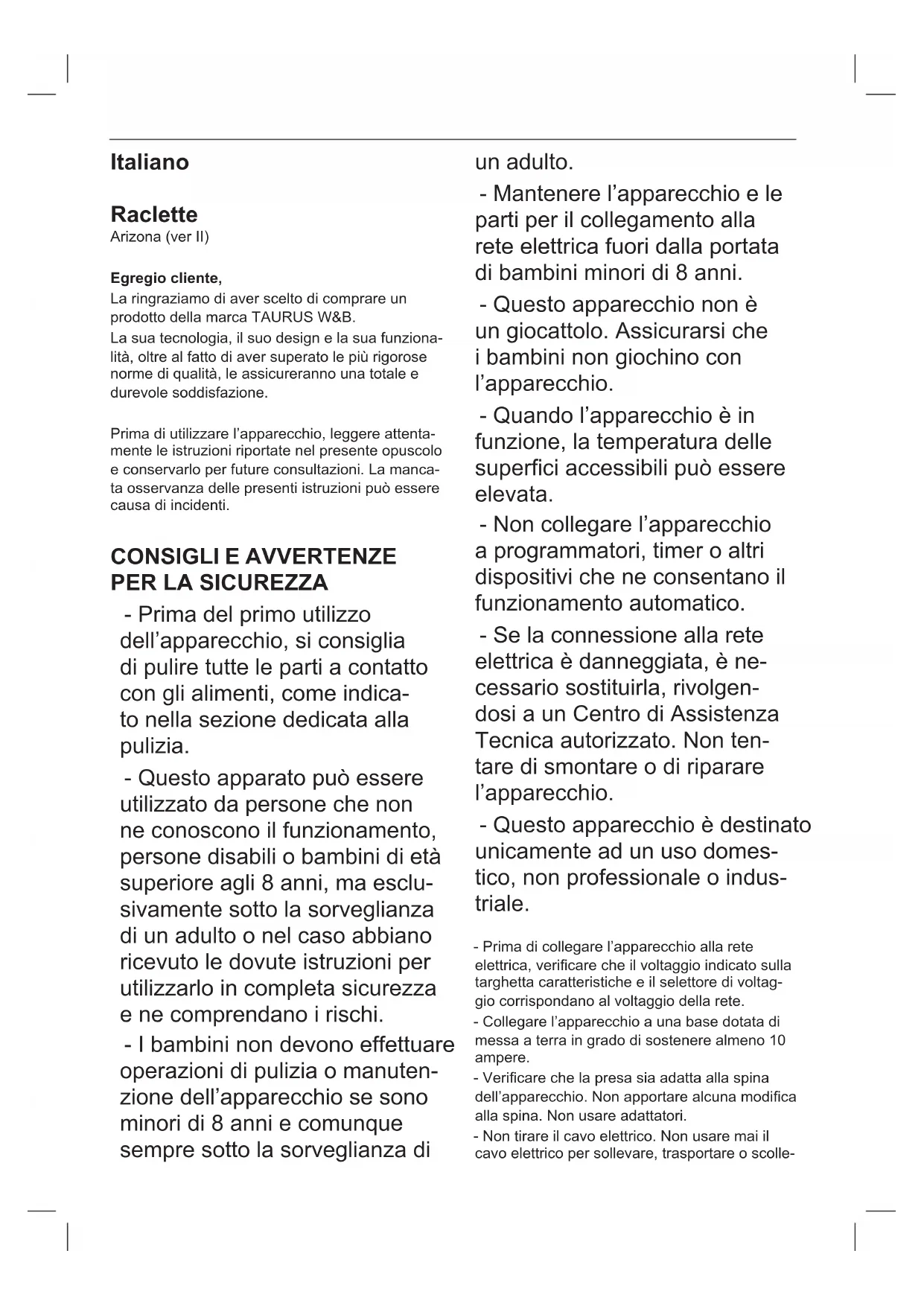 - I materiali che costituiscono l’imballaggio di questo apparecchio sono compresi in un sistema di raccolta, classicazione e riciclaggio degli stessi. Per lo smaltimento, utilizzare gli appositi contenitori pubblici, adatti per ogni tipo di materiale. - Il prodotto non contiene concentrazioni di sos- tanze considerate dannose per l’ambiente. Questo simbolo indica che, per smaltire il prodotto al termine della sua durata utile, occorre depositarlo presso un ente di smaltimento autorizzato alla raccolta differenziata di riuti di apparecchiature elettriche ed elettroniche (RAEE). Questo apparecchio rispetta la Direttiva 2014/35/ UE di Bassa Tensione, la Direttiva 2014/30/UE di Compatibilità Elettromagnetica, la Direttiva 2011/65/UE sui limiti d’impiego di determinate sostanze pericolose negli apparecchi elettrici ed elettronici e la Direttiva 2009/125/CE riguardante l’Ecodesign dei prodotti che consumano energia.Português Raclette Arizona (ver II) Caro cliente: Obrigado por ter adquirido um produto da marca TAURUS W&B.. A sua tecnologia, design e funcionalidade, aliados às mais rigorosas normas de qualidade, garantir- lhe-ão uma total satisfação durante muito tempo. Leia atentamente este manual de instruções an- tes de ligar o aparelho e guarde-o para consultas futuras. A não observância e cumprimento destas instruções pode resultar em acidente.