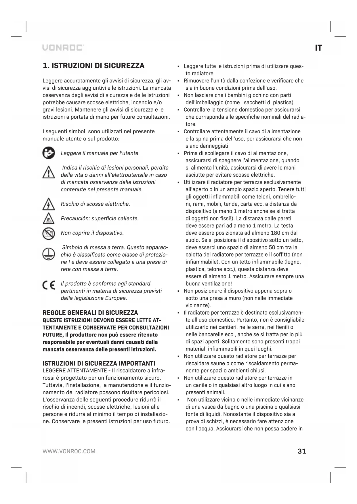 LEGGERE ATTENTAMENTE - Il riscaldatore a infra- rossi è progettato per un funzionamento sicuro. Tuttavia, l’installazione, la manutenzione e il funzio- namento del radiatore possono risultare pericolosi. L’osservanza delle seguenti procedure ridurrà il rischio di incendi, scosse elettriche, lesioni alle persone e ridurrà al minimo il tempo di installazio- ne. Conservare le presenti istruzioni per uso futuro.