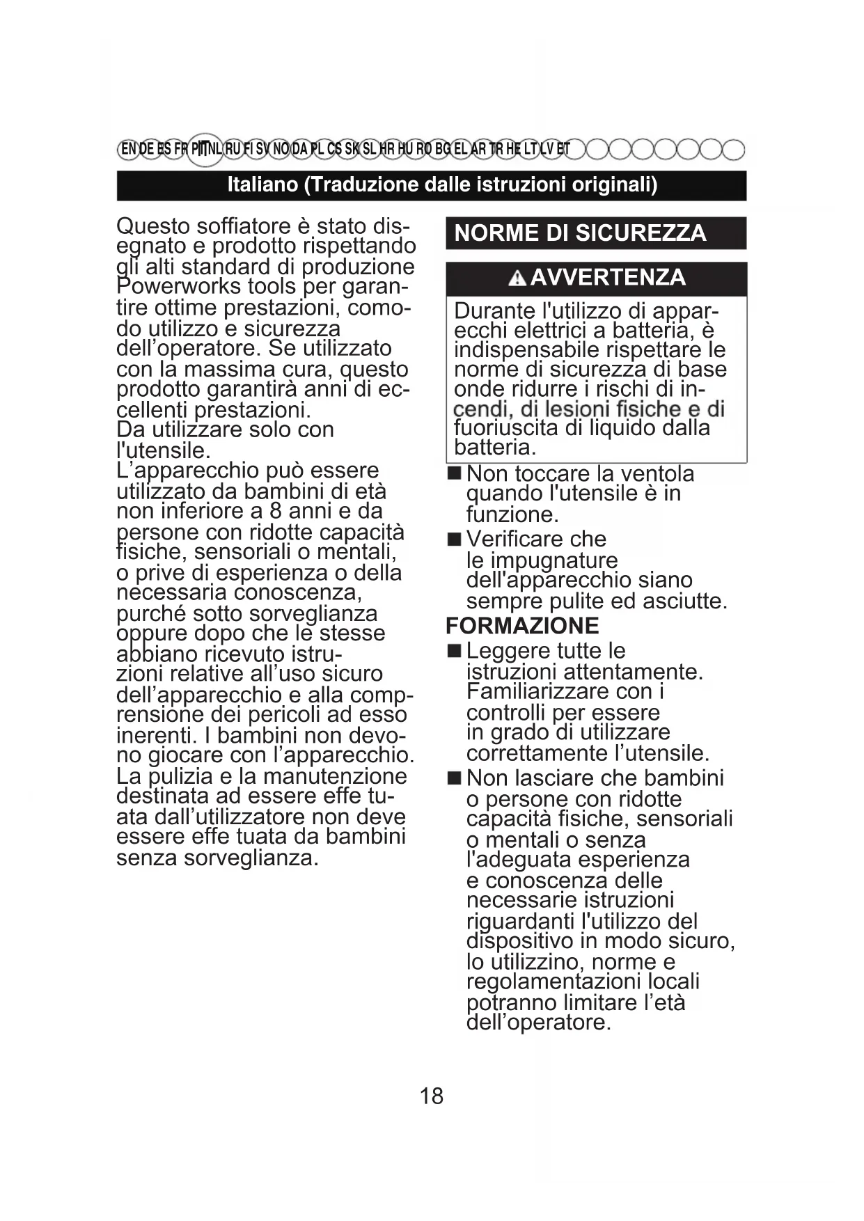 EN DE ES FR PT NL RU FI SV NO DA PL CS SK SL HR HU RO BG EL AR TR HE LT LV ET Questo soffiatore è stato dis- egnato e prodotto rispettando gli alti standard di produzione Powerworks tools per garan- tire ottime prestazioni, como- do utilizzo e sicurezza dell’operatore. Se utilizzato con la massima cura, questo prodotto garantirà anni di ec- cellenti prestazioni. Da utilizzare solo con l'utensile. L’apparecchio può essere utilizzato da bambini di età non inferiore a 8 anni e da persone con ridotte capacità fisiche, sensoriali o mentali, o prive di esperienza o della necessaria conoscenza, purché sotto sorveglianza oppure dopo che le stesse abbiano ricevuto istru- zioni relative all’uso sicuro dell’apparecchio e alla comp- rensione dei pericoli ad esso inerenti. I bambini non devo- no giocare con l’apparecchio. La pulizia e la manutenzione destinata ad essere effe tu- ata dall’utilizzatore non deve essere effe tuata da bambini senza sorveglianza.