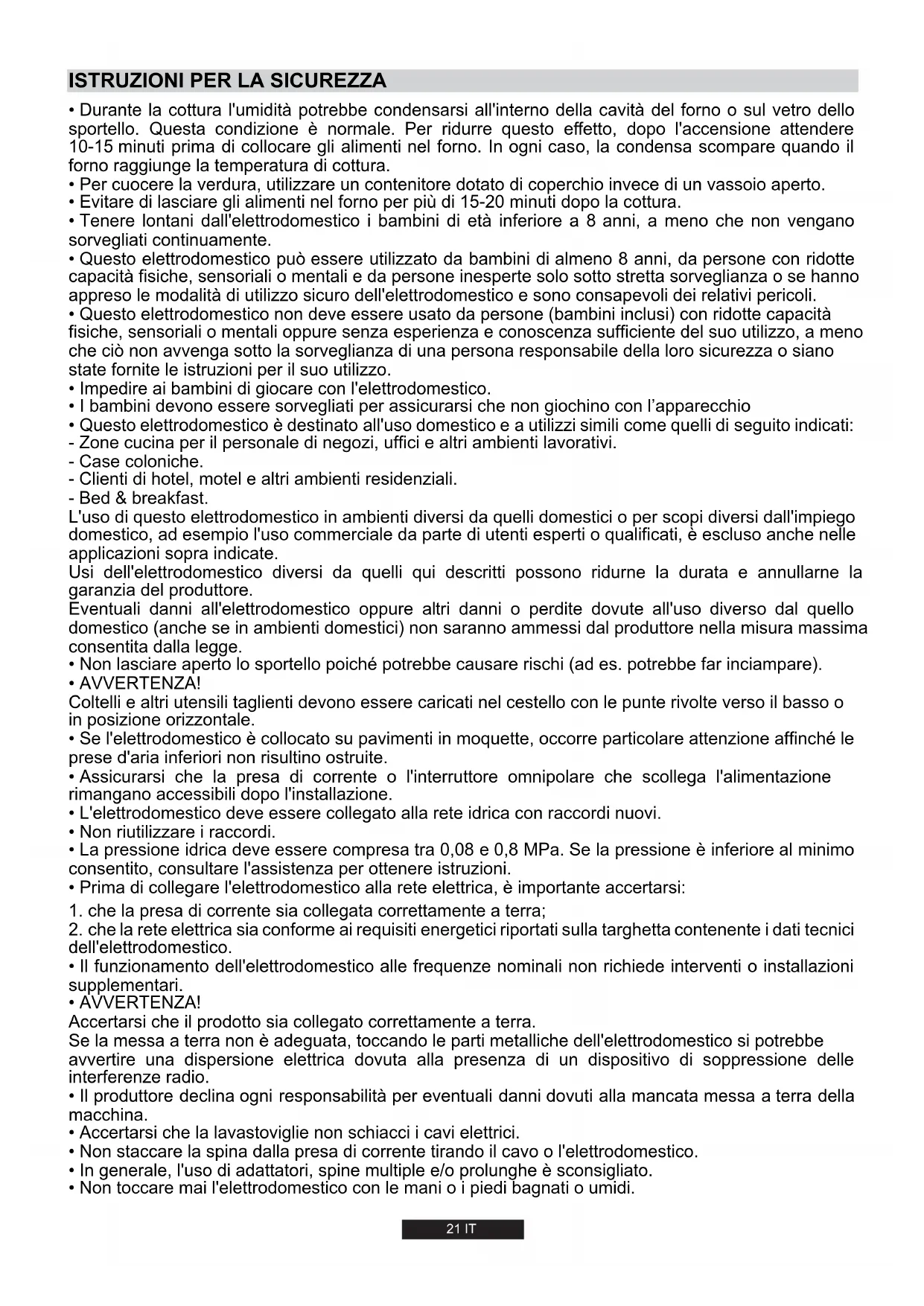 - Utilizzare il forno solo per gli scopi previsti, cioè solo per la cottura di alimenti; altri usi, ad es. come fonte di calore, sono considerati impropri e quindi pericolosi. Il produttore non può essere ritenuto responsabile di eventuali danni causati da usi errati, impropri o irragionevoli.