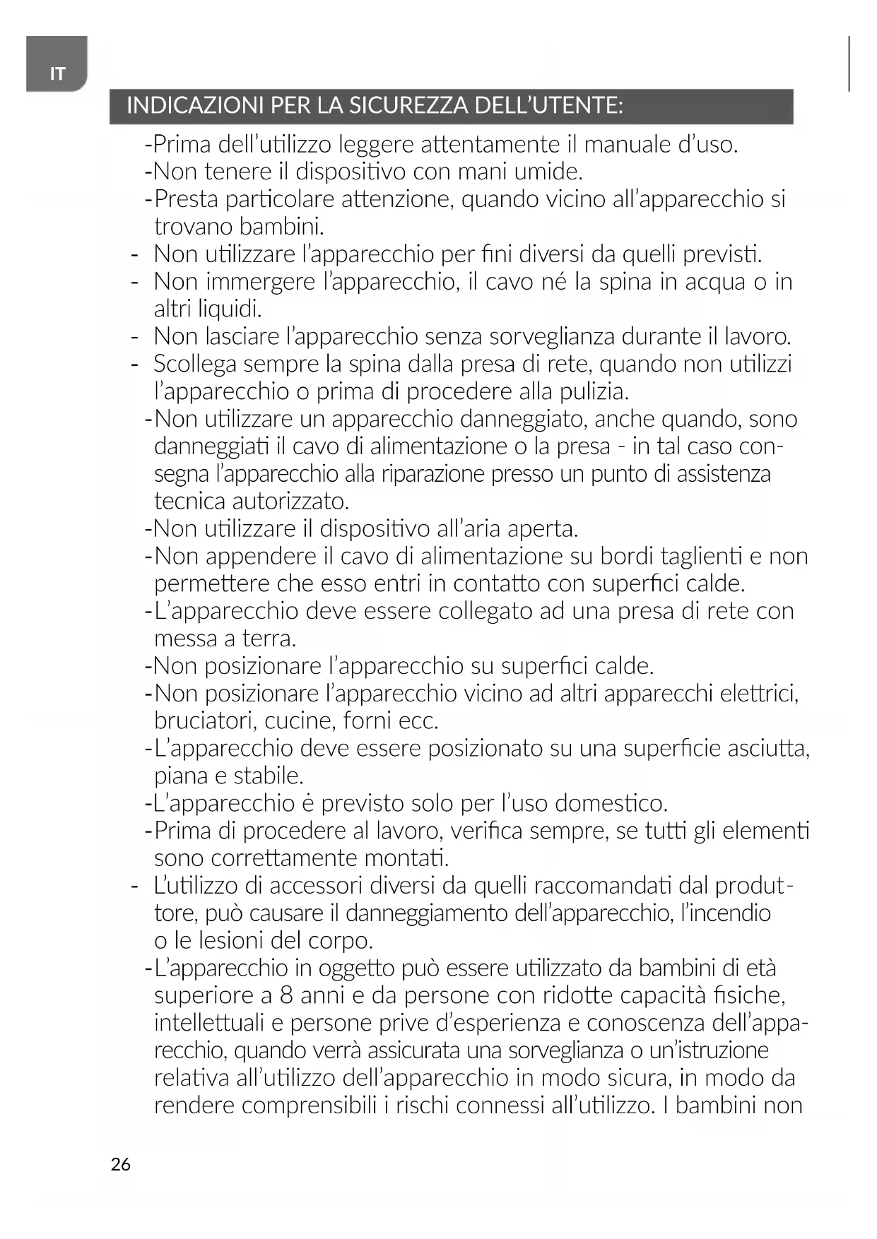 L’apparecchio in oggeo può essere ulizzato da bambini di età superiore a 8 anni e da persone con ridoe capacità siche, intelleuali e persone prive d’esperienza e conoscenza dell’appa- recchio, quando verrà assicurata una sorveglianza o un’istruzione relava all’ulizzo dell’apparecchio in modo sicura, in modo da rendere comprensibili i rischi connessi all’ulizzo. I bambini non27