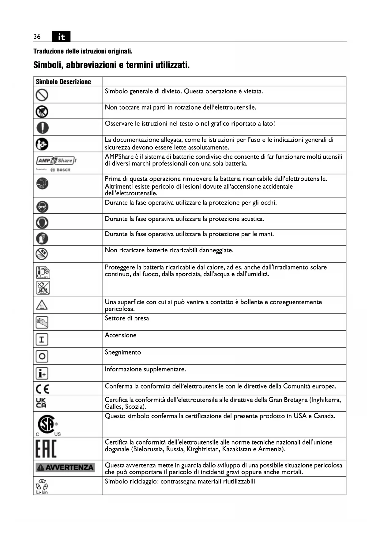 Traduzione delle istruzioni originali. Simboli, abbreviazioni e termini utilizzati. Simbolo Descrizione Simbolo generale di divieto. Questa operazione è vietata. Non toccare mai parti in rotazione dell’elettroutensile. Osservare le istruzioni nel testo o nel grafico riportato a lato! La documentazione allegata, come le istruzioni per l’uso e le indicazioni generali di sicurezza devono essere lette assolutamente. AMPShare è il sistema di batterie condiviso che consente di far funzionare molti utensili di diversi marchi professionali con una sola batteria. Prima di questa operazione rimuovere la batteria ricaricabile dall’elettroutensile. Altrimenti esiste pericolo di lesioni dovute all’accensione accidentale dell’elettroutensile. Durante la fase operativa utilizzare la protezione per gli occhi. Durante la fase operativa utilizzare la protezione acustica. Durante la fase operativa utilizzare la protezione per le mani. Non ricaricare batterie ricaricabili danneggiate. Proteggere la batteria ricaricabile dal calore, ad es. anche dall'irradiamento solare continuo, dal fuoco, dalla sporcizia, dall'acqua e dall'umidità. Una superficie con cui si può venire a contatto è bollente e conseguentemente pericolosa. Settore di presa Accensione Spegnimento Informazione supplementare. Conferma la conformità dell’elettroutensile con le direttive della Comunità europea. Certifica la conformità dell'elettroutensile alle direttive della Gran Bretagna (Inghilterra, Galles, Scozia). Questo simbolo conferma la certificazione del presente prodotto in USA e Canada. Certifica la conformità dell'elettroutensile alle norme tecniche nazionali dell'unione doganale (Bielorussia, Russia, Kirghizistan, Kazakistan e Armenia). Questa avvertenza mette in guardia dallo sviluppo di una possibile situazione pericolosa che può comportare il pericolo di incidenti gravi oppure anche mortali. Simbolo riciclaggio: contrassegna materiali riutilizzabili max.50°C37