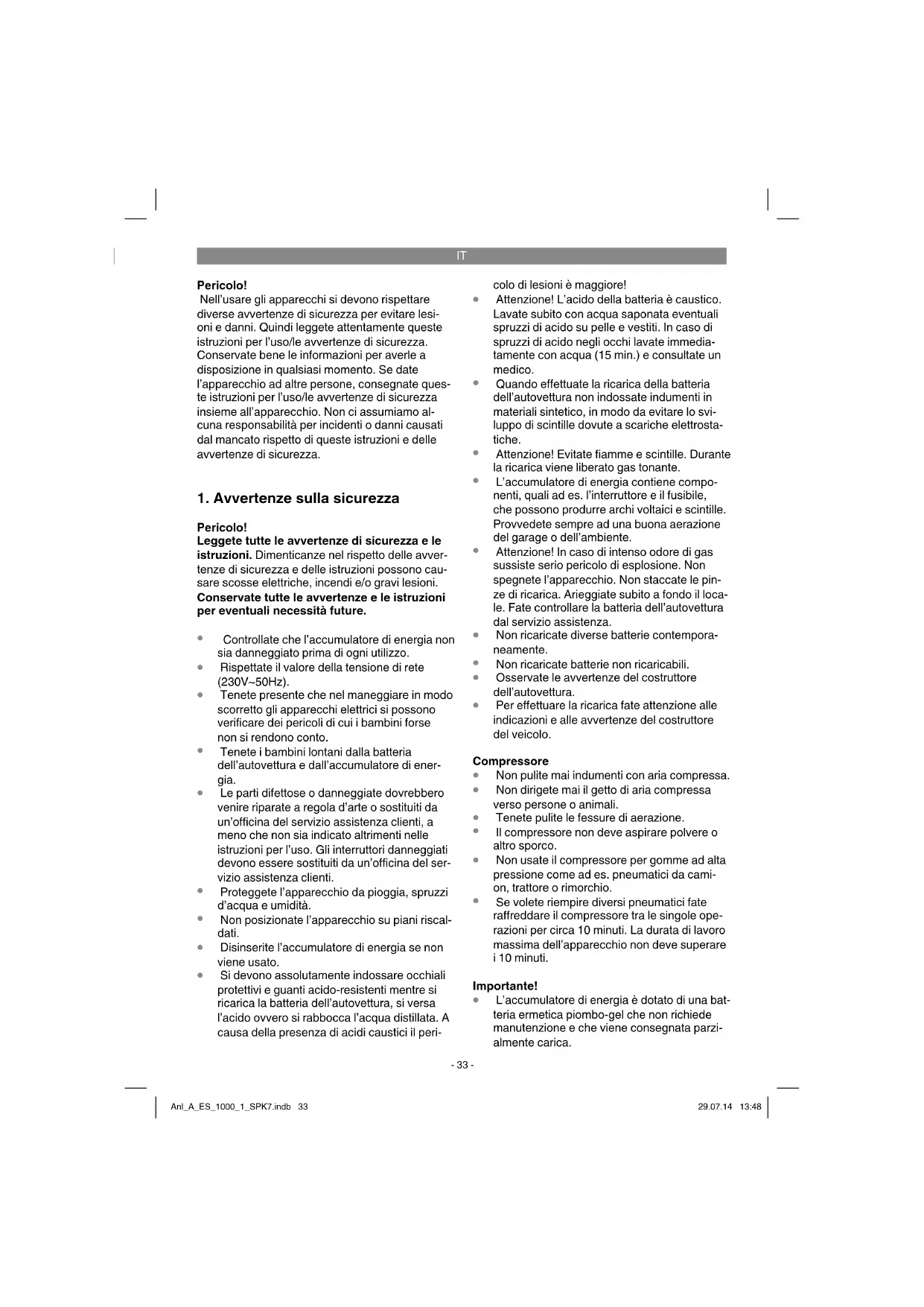 L’accumulatore di energia è dotato di una bat- teria ermetica piombo-gel che non richiede manutenzione e che viene consegnata parzi- almente carica. Anl_A_ES_1000_1_SPK7.indb 33Anl_A_ES_1000_1_SPK7.indb 33 29.07.14 13:4829.07.14 13:48IT