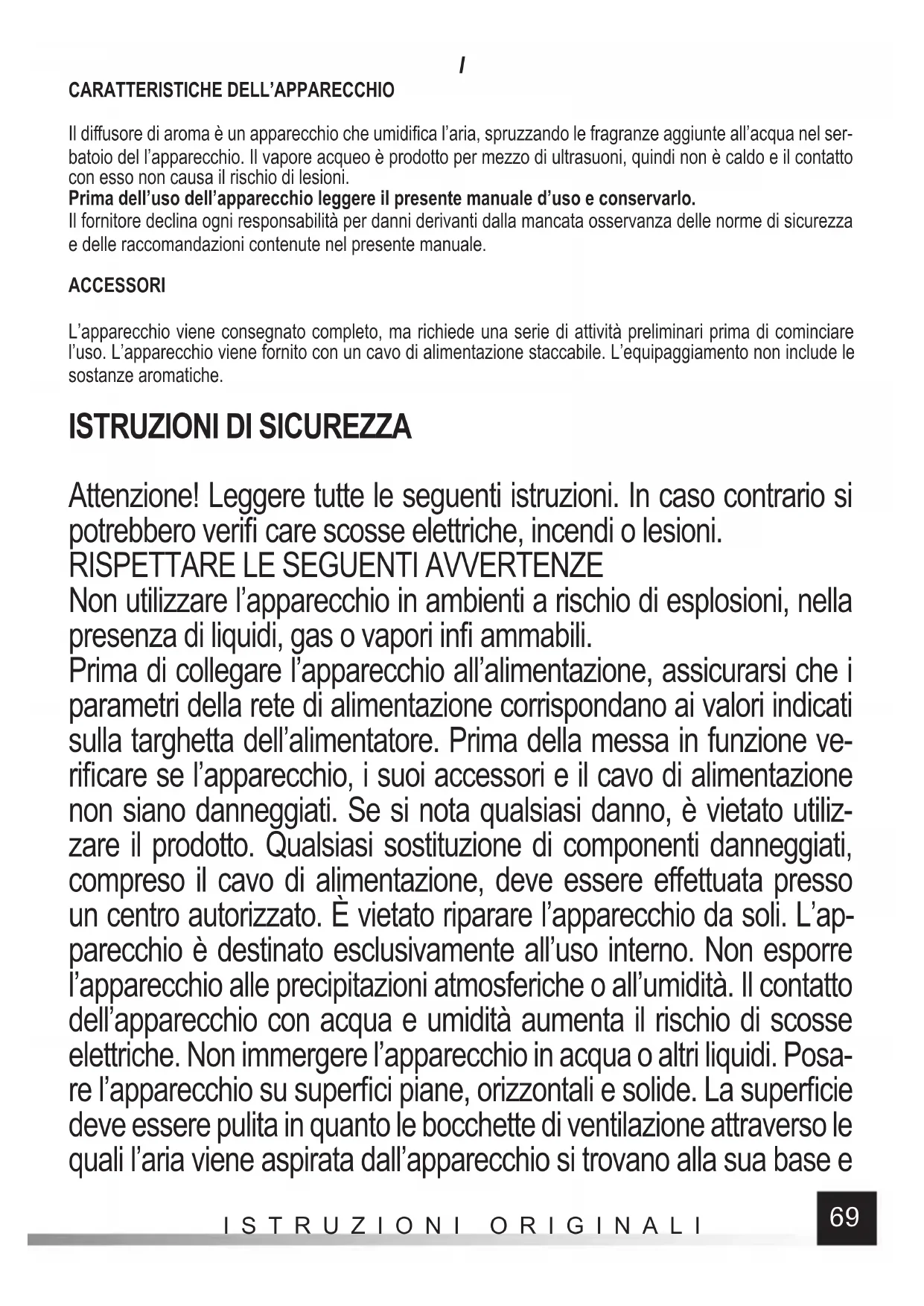 Il diff usore di aroma è un apparecchio che umidifi ca l’aria, spruzzando le fragranze aggiunte all’acqua nel ser- batoio del l’apparecchio. Il vapore acqueo è prodotto per mezzo di ultrasuoni, quindi non è caldo e il contatto con esso non causa il rischio di lesioni. Prima dell’uso dell’apparecchio leggere il presente manuale d’uso e conservarlo. Il fornitore declina ogni responsabilità per danni derivanti dalla mancata osservanza delle norme di sicurezza e delle raccomandazioni contenute nel presente manuale. ACCESSORI L’apparecchio viene consegnato completo, ma richiede una serie di attività preliminari prima di cominciare l’uso. L’apparecchio viene fornito con un cavo di alimentazione staccabile. L’equipaggiamento non include le sostanze aromatiche.