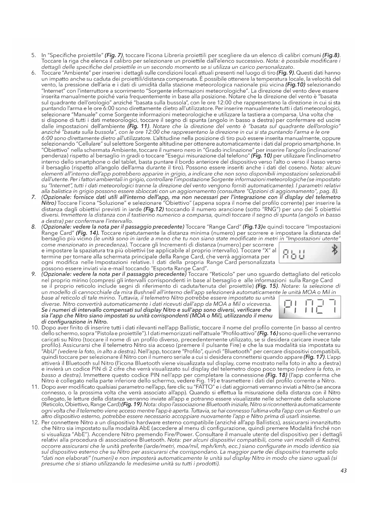 nel proprio mirino (compresi gli intervalli corrispondenti in base al bersaglio e alle informazioni sulla Range Card se il proprio reticolo include segni di riferimento di caduta/tenuta del proiettile) (Fig. 15). Notare: la selezione di un modello di cannocchiale da mira Bushnell all’interno dell’app selezionerà automaticamente le unità MOA o Mil in base al reticolo di tale mirino. Tuttavia, il telemetro Nitro potrebbe essere impostato su unità diverse. Nitro convertirà automaticamente i dati ricevuti dall’app da MOA a Mil o viceversa. Se i numeri di intervallo compensati sul display Nitro e sull’app sono diversi, vericare che sia l’app che Nitro siano impostati su unità corrispondenti (MOA o Mil), utilizzando il menu di congurazione in Nitro. 10. Dopo aver nito di inserire tutti i dati rilevanti nell’app Ballistic, toccare il nome del prolo corrente (in basso al centro dello schermo, sopra “Pistola e proiettile”). I dati memorizzati nell’attuale “Prolo attivo” (Fig. 16) sono quelli che verranno caricati su Nitro (toccare il nome di un prolo diverso, precedentemente utilizzato, se si desidera caricare invece tale prolo). Assicurarsi che il telemetro Nitro sia acceso (premere il pulsante Fire) e che la sua modalità sia impostata su “AbU” (vedere la foto, in alto a destra). Nell’app, toccare “Profilo”, quindi “Bluetooth” per cercare dispositivi compatibili, quindi toccare per selezionare il Nitro con il numero seriale a cui si desidera connettersi quando appare (Fig. 17). L’app attiverà il Bluetooth sul Nitro (l’icona Bluetooth viene visualizzata sul display, come mostrato nella foto in alto a destra) e invierà un codice PIN di 2 cifre che verrà visualizzato sul display del telemetro dopo poco tempo (vedere la foto, in basso a destra). Immettere questo codice PIN nell’app per completare la connessione (Fig. 18) (l’app conferma che Nitro è collegato nella parte inferiore dello schermo, vedere Fig. 19) e trasmettere i dati del profilo corrente a Nitro. 11. Dopo aver modificato qualsiasi parametro nell’app, fare clic su “FATTO” e i dati aggiornati verranno inviati a Nitro (se ancora connesso, o la prossima volta che verrà associato all’app). Quando si effettua la misurazione della distanza con il Nitro collegato, le letture della distanza verranno inviate all’app e potranno essere visualizzate nelle schermate della soluzione (Reticolo, Obiettivo, Range Card) (Fig. 19). Nota: dopo l’associazione Bluetooth iniziale, Nitro si riconnetterà automaticamente ogni volta che il telemetro viene acceso mentre l’app è aperta. Tuttavia, se hai connesso l’ultima volta l’app con un Kestrel o un altro dispositivo esterno, potrebbe essere necessario accoppiare nuovamente l’app e Nitro prima di usarli insieme. 12. Per connettere Nitro a un dispositivo hardware esterno compatibile (anziché all’app Ballistics), assicurarsi innanzitutto che Nitro sia impostato sulla modalità AbE (accedere al menu di configurazione, quindi premere Modalità finché non si visualizza “AbE”). Accendere Nitro premendo Fire/Power. Consultare il manuale utente del dispositivo per i dettagli relativi alla procedura di associazione Bluetooth. Nota: per alcuni dispositivi compatibili, come vari modelli di Kestrel, occorre assicurarsi che le unità preferite (iarde/metri, moa/mil, mph/kmh, ecc.) siano configurate in modo identico sia sul dispositivo esterno che su Nitro per assicurarsi che corrispondano. La maggior parte dei dispositivi trasmette solo “dati non elaborati” (numeri) e non imposterà automaticamente le unità sul display Nitro in modo che siano uguali (si presume che si stiano utilizzando le medesime unità su tutti i prodotti).44