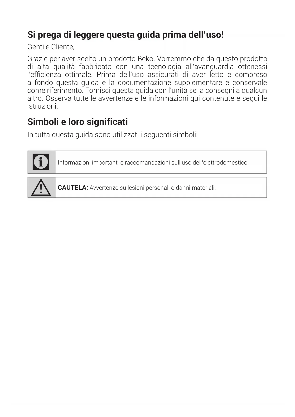ATTENTION : Si le produit ne fonctionne pas nor- malement après avoir suivi les étapes ci-dessus, veuillez contacter notre service après-vente pour obtenir de l'aide.Si prega di leggere questa guida prima dell’uso! Gentile Cliente, Grazie per aver scelto un prodotto Beko. Vorremmo che da questo prodotto di alta qualità fabbricato con una tecnologia all'avanguardia ottenessi l'efficienza ottimale. Prima dell'uso assicurati di aver letto e compreso a fondo questa guida e la documentazione supplementare e conservale come riferimento. Fornisci questa guida con l'unità se la consegni a qualcun altro. Osserva tutte le avvertenze e le informazioni qui contenute e segui le istruzioni. Simboli e loro significati In tutta questa guida sono utilizzati i seguenti simboli: