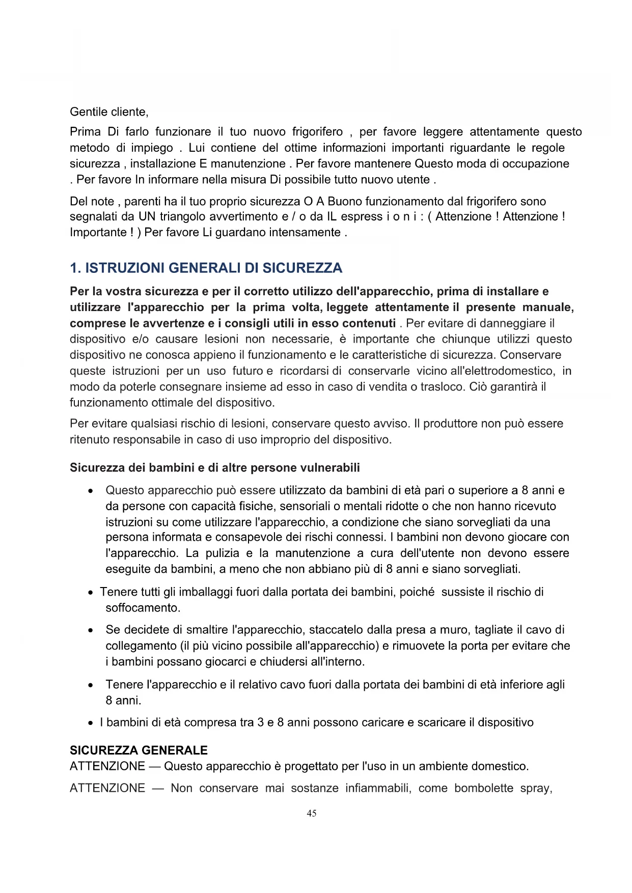 - I bambini di età compresa tra 3 e 8 anni possono caricare e scaricare il dispositivo SICUREZZA GENERALE ATTENZIONE — Questo apparecchio è progettato per l'uso in un ambiente domestico. ATTENZIONE — Non conservare mai sostanze infiammabili, come bombolette spray,46 all'interno dell'apparecchio, poiché potrebbero fuoriuscire. ATTENZIONE — Se il cavo di alimentazione è danneggiato, è necessario farlo sostituire immediatamente dal produttore o da un rivenditore qualificato per evitare qualsiasi rischio di scossa elettrica. ATTENZIONE — Non danneggiare il circuito di refrigerazione. ATTENZIONE — Non utilizzare apparecchi elettrici all'interno del vano, a meno che non siano autorizzati dal produttore. ATTENZIONE — Il sistema refrigerante e di isolamento contengono gas infiammabili. Quando si smaltisce l'apparecchio, farlo presso un centro di raccolta autorizzato. Non esporre mai il dispositivo alle fiamme. Liquido refrigerante Nel circuito refrigerante dell'apparecchio viene utilizzato il refrigerante isobutano (R ). 600aÈ un gas naturale altamente infiammabile e quindi pericoloso per l'ambiente. Durante il trasporto e l'installazione dell'apparecchio, verificare che nessuno dei componenti del circuito frigorifero sia danneggiato. Il refrigerante (R 600a) è un liquido infiammabile. Attenzione: pericolo di incendio Se il circuito frigorifero è danneggiato: