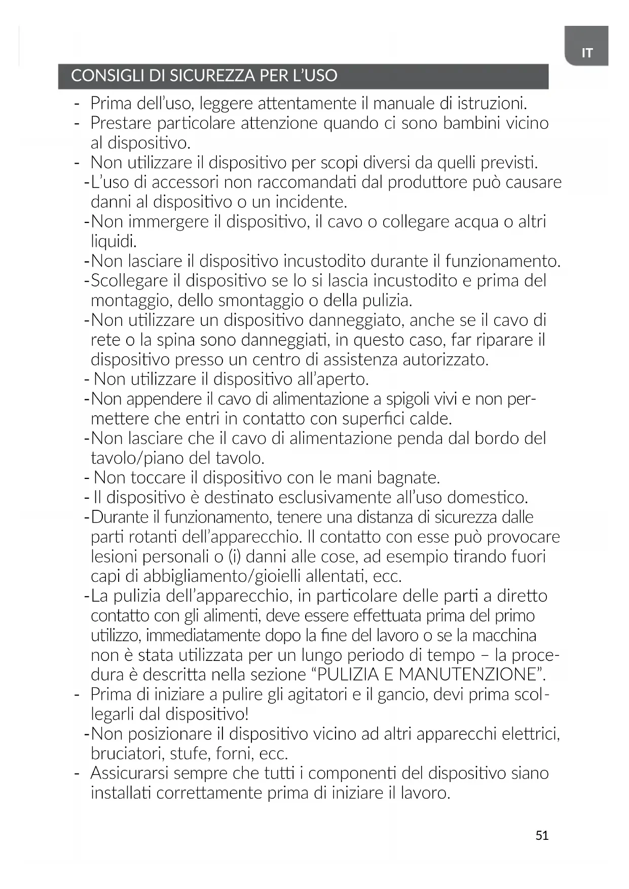 La pulizia dell’apparecchio, in parcolare delle par a direo contao con gli alimen, deve essere eeuata prima del primo ulizzo, immediatamente dopo la ne del lavoro o se la macchina non è stata ulizzata per un lungo periodo di tempo – la proce- dura è descria nella sezione “PULIZIA E MANUTENZIONE”. - Prima di iniziare a pulire gli agitatori e il gancio, devi prima scol