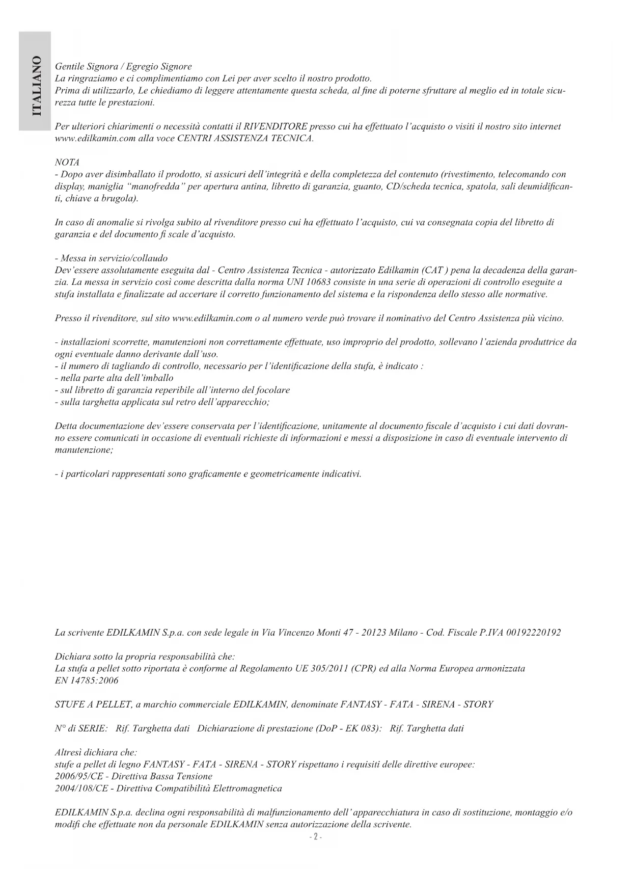 I Installazione, uso e manutenzione pag. 2 UK Installation, use and maintenance pag. 25 F Installation, usage et maintenance pag. 48 E Instalación, uso y mantenimiento pag. 71 D Installations-, Betriebs- und Wartungsanleitung pag. 94 NL Installatie, gebruik en onderhoud pag. 117 GR Εγκατάσταση, χρήση και συντήρηση pag. 140 PL Instalacja, obsługa i konserwacja pag. 163 PT Instalação, uso e manutenção pág. 186- 2 - ITALIANO Gentile Signora / Egregio Signore La ringraziamo e ci complimentiamo con Lei per aver scelto il nostro prodotto. Prima di utilizzarlo, Le chiediamo di leggere attentamente questa scheda, al fi ne di poterne sfruttare al meglio ed in totale sicu- rezza tutte le prestazioni. Per ulteriori chiarimenti o necessità contatti il RIVENDITORE presso cui ha effettuato l’acquisto o visiti il nostro sito internet www.edilkamin.com alla voce CENTRI ASSISTENZA TECNICA. NOTA - Dopo aver disimballato il prodotto, si assicuri dell’integrità e della completezza del contenuto (rivestimento, telecomando con display, maniglia “manofredda” per apertura antina, libretto di garanzia, guanto, CD/scheda tecnica, spatola, sali deumidifi can- ti, chiave a brugola). In caso di anomalie si rivolga subito al rivenditore presso cui ha effettuato l’acquisto, cui va consegnata copia del libretto di garanzia e del documento fi scale d’acquisto. - Messa in servizio/collaudo Dev’essere assolutamente eseguita dal - Centro Assistenza Tecnica - autorizzato Edilkamin (CAT ) pena la decadenza della garan- zia. La messa in servizio così come descritta dalla norma UNI 10683 consiste in una serie di operazioni di controllo eseguite a stufa installata e fi nalizzate ad accertare il corretto funzionamento del sistema e la rispondenza dello stesso alle normative. Presso il rivenditore, sul sito www.edilkamin.com o al numero verde può trovare il nominativo del Centro Assistenza più vicino. - installazioni scorrette, manutenzioni non correttamente effettuate, uso improprio del prodotto, sollevano l’azienda produttrice da ogni eventuale danno derivante dall’uso. - il numero di tagliando di controllo, necessario per l’identifi cazione della stufa, è indicato : - nella parte alta dell’imballo - sul libretto di garanzia reperibile all’interno del focolare - sulla targhetta applicata sul retro dell’apparecchio; Detta documentazione dev’essere conservata per l’identifi cazione, unitamente al documento fi scale d’acquisto i cui dati dovran- no essere comunicati in occasione di eventuali richieste di informazioni e messi a disposizione in caso di eventuale intervento di manutenzione; - i particolari rappresentati sono grafi camente e geometricamente indicativi. La scrivente EDILKAMIN S.p.a. con sede legale in Via Vincenzo Monti 47 - 20123 Milano - Cod. Fiscale P.IVA 00192220192 Dichiara sotto la propria responsabilità che: La stufa a pellet sotto riportata è conforme al Regolamento UE 305/2011 (CPR) ed alla Norma Europea armonizzata EN 14785:2006 STUFE A PELLET, a marchio commerciale EDILKAMIN, denominate FANTASY - FATA - SIRENA - STORY N° di SERIE: Rif. Targhetta dati Dichiarazione di prestazione (DoP - EK 083): Rif. Targhetta dati Altresì dichiara che: stufe a pellet di legno FANTASY - FATA - SIRENA - STORY rispettano i requisiti delle direttive europee: 2006/95/CE - Direttiva Bassa Tensione 2004/108/CE - Direttiva Compatibilità Elettromagnetica EDILKAMIN S.p.a. declina ogni responsabilità di malfunzionamento dell’ apparecchiatura in caso di sostituzione, montaggio e/o modifi che effettuate non da personale EDILKAMIN senza autorizzazione della scrivente.- 3 - ITALIANO