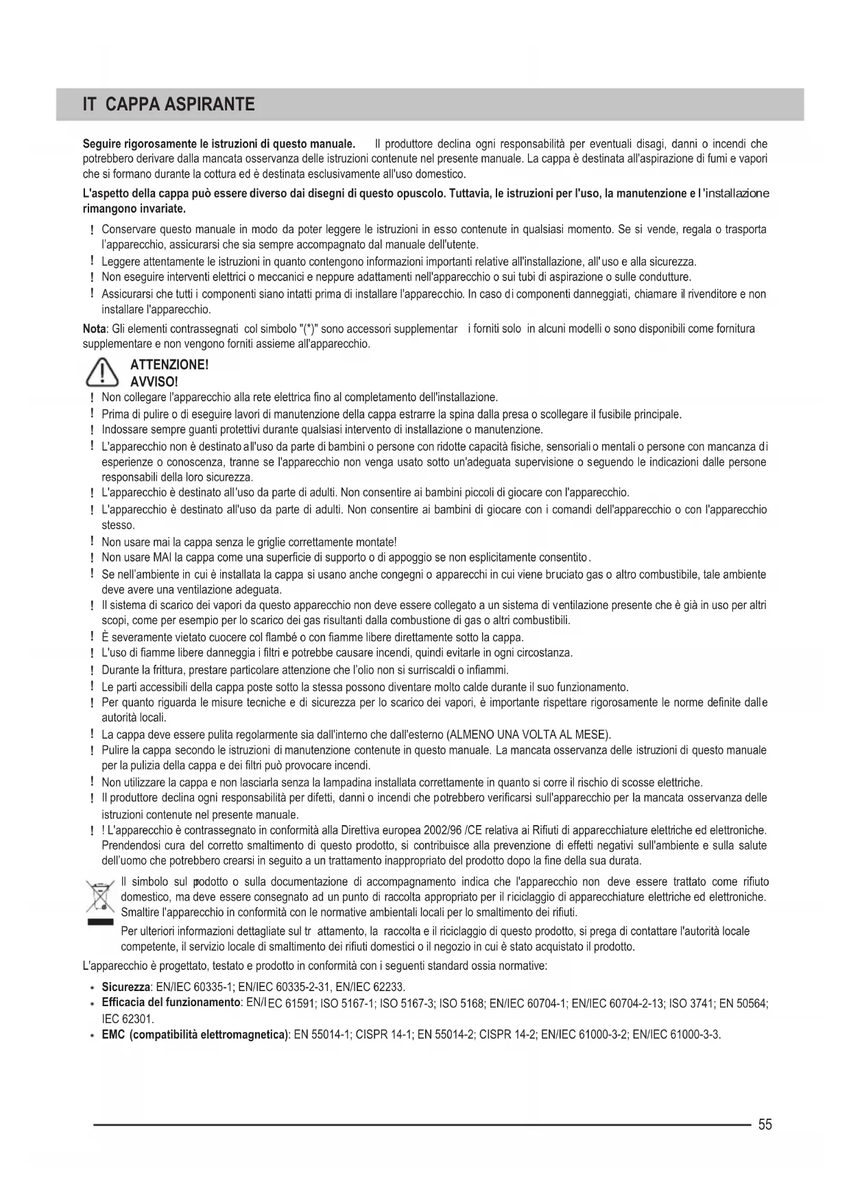 autorità locali. La cappa deve essere pulita regolarmente sia dall'interno che dall'esterno (ALMENO UNA VOLTA AL MESE). Pulire la cappa secondo le istruzioni di manutenzione contenute in questo manuale. La mancata osservanza delle istruzioni di questo manuale per la pulizia della cappa e dei filtri può provocare incendi. Non utilizzare la cappa e non lasciarla senza la lampadina installata correttamente in quanto si corre il rischio di scosse elettriche. Il produttore declina ogni responsabilità per difetti, danni o incendi che potrebbero verificarsi sull'apparecchio per la mancata oss ervanza delle istruzioni contenute nel presente manuale. ! L'apparecchio è co ntrassegnato in conformità alla Direttiva europea 2002/96 /CE relativa ai Rifiuti di apparecchiature elettriche ed elettroniche. Prendendosi cura del corretto smaltimento di questo prodotto, si contribuisce alla prevenzione di effetti negativi sull'ambiente e sulla salute dell’uomo che potrebbero crearsi in seguito a un trattamento inappropriato del prodotto dopo la fine della sua durata. Il simbolo sul p rodotto o sulla documentazione di accompagnamento indica che l'apparecchio non deve essere trattato come rifiuto domestico, ma deve essere consegnato ad un punto di raccolta appropriato per il riciclaggio di apparecchiature elettriche ed elettroniche. Smaltire l'apparecchio in conformità con le normative ambientali locali per lo smaltimento dei rifiuti. Per ulteriori informazioni dettagliate sul tr attamento, la raccolta e il riciclaggio di questo prodotto, si prega di contattare l'autorità locale competente, il servizio locale di smaltimento dei rifiuti domestici o il negozio in cui è stato acquistato il prodotto. L'apparecchio è progettato, testato e prodotto in conformità con i seguenti standard ossia normativ