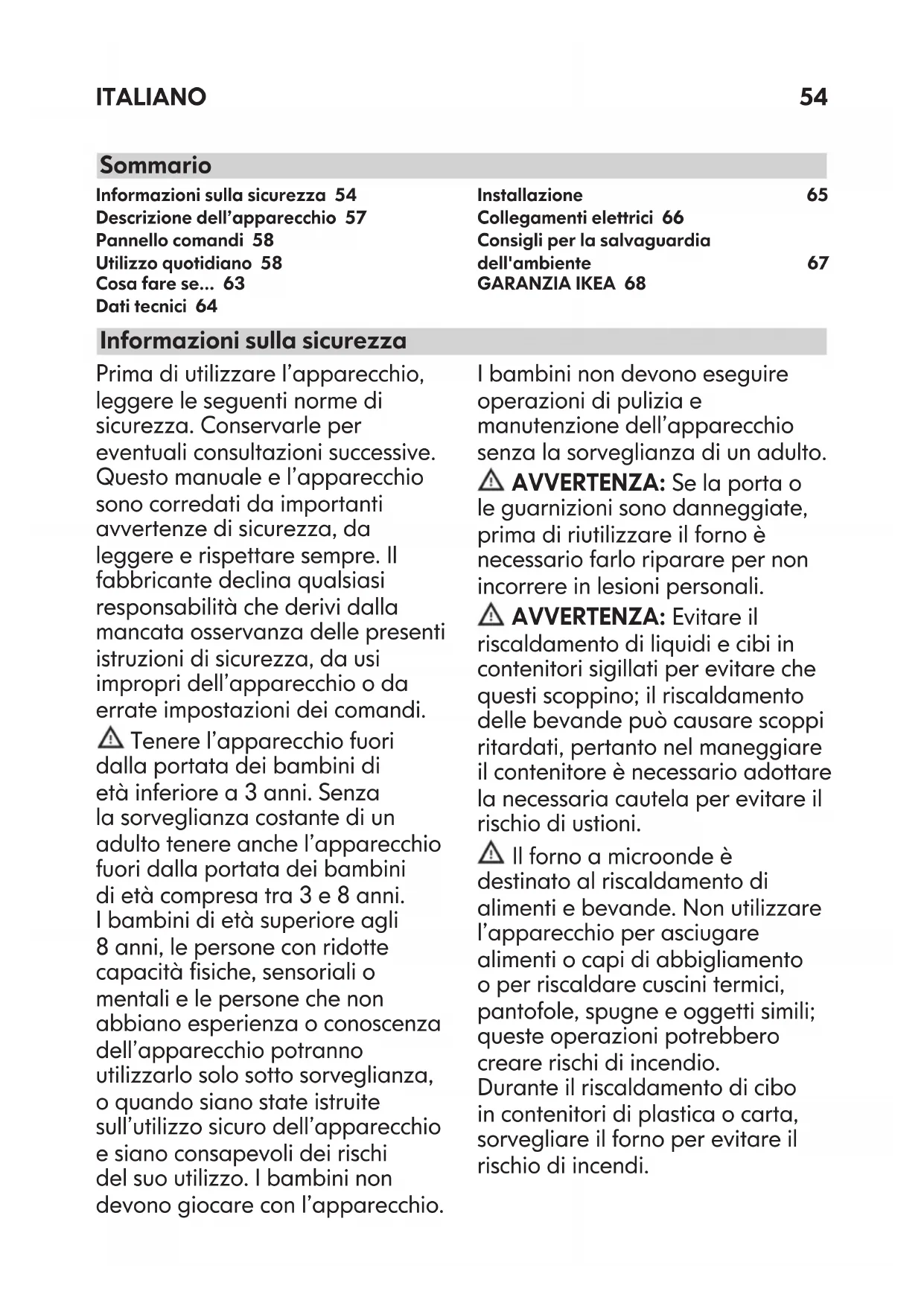 Preriscaldare il forno solo se specicato nella tabella di cottura o nella ricetta. Usare teglie laccate o smaltate in colori scuri, in quanto assorbono il calore in modo più efciente. Gli alimenti che richiedono tempi di cottura lunghi continueranno comunque a cuocere anche a forno spento. nITALIANO 68 GARANZIA IKEA Quanto dura la garanzia IKEA? Questa garanzia è valida per 5 anni a partire dalla data di acquisto/consegna del tuo elettrodomestico presso un negozio IKEA. È necessario esibire lo scontrino originale come documento comprovante l’acquisto. Eventuali interventi di assistenza effettuati durante la garanzia non ne estenderanno la validità. Chi fornisce il servizio? Il servizio assistenza selezionato ed autorizzato da IKEA fornirà il servizio attraverso la propria rete di Partner di Assistenza autorizzati. Cosa copre questa garanzia? La garanzia copre i difetti dell’elettrodomestico causati da vizi di fabbricazione (difetto funzionale), a partire dalla data di acquisto/consegna dell’elettrodomestico. Questa garanzia è applicabile solo all’uso domestico. Le eccezioni sono descritte alla voce “Cosa non è coperto dalla garanzia?”. Nel periodo di validità della garanzia, i costi di riparazione (pezzi di ricambio, manodopera e viaggi del personale tecnico) saranno sostenuti dal servizio assistenza, fermo restando che l’accesso all’apparecchiatura per l’intervento di riparazione non comporti spese particolari. Queste condizioni sono conformi alle norme locali ed alle norme in vigore in Svizzera. I componenti sostituiti diventano proprietà di IKEA. Come IKEA interverrà per risolvere il problema? Il servizio assistenza incaricato da IKEA per l’esecuzione del servizio esaminerà il prodotto e deciderà, a propria esclusiva discrezione, se lo stesso rientra nella copertura della garanzia. Il Servizio Assistenza IKEA o il suo Partner di Assistenza autorizzato tramite i rispettivi Centri di Assistenza, a propria esclusiva discrezione, riparerà il prodotto difettoso o provvederà a sostituirlo con un prodotto uguale o di pari valore. Cosa non è coperto dalla garanzia?