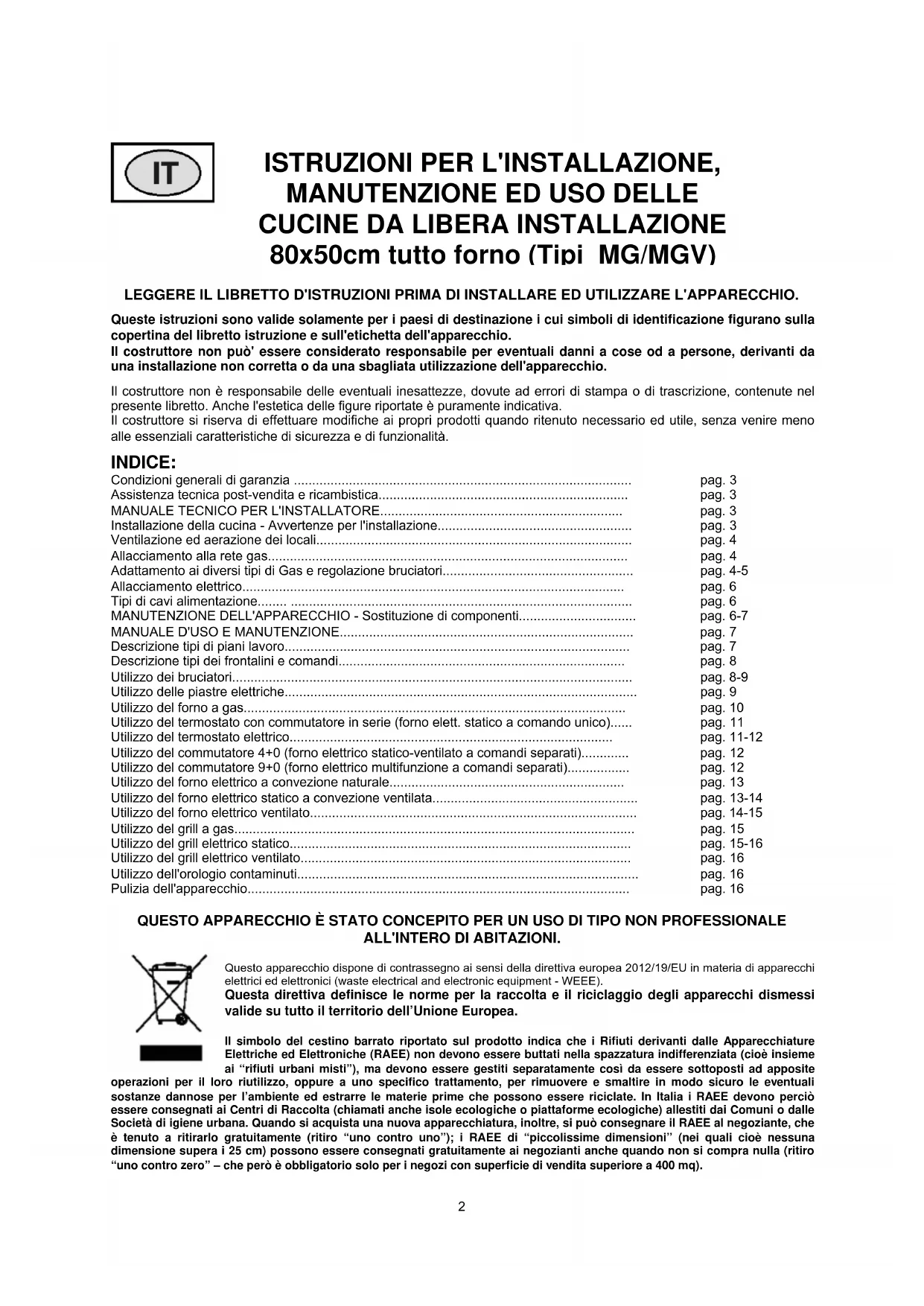 LEGGERE IL LIBRETTO D'ISTRUZIONI PRIMA DI INSTALLARE ED UTILIZZARE L'APPARECCHIO. Queste istruzioni sono valide solamente per i paesi di destinazione i cui simboli di identificazione figurano sulla copertina del libretto istruzione e sull'etichetta dell'apparecchio. Il costruttore non può' essere considerato responsabile per eventuali danni a cose od a persone, derivanti da una installazione non corretta o da una sbagliata utilizzazione dell'apparecchio. Il costruttore non è responsabile delle eventuali inesattezze, dovute ad errori di stampa o di trascrizione, contenute nel presente libretto. Anche l'estetica delle figure riportate è puramente indicativa. Il costruttore si riserva di effettuare modifiche ai propri prodotti quando ritenuto necessario ed utile, senza venire meno alle essenziali caratteristiche di sicurezza e di funzionalità. INDICE: Condizioni generali di garanzia ............................................................................................ pag. 3 Assistenza tecnica post-vendita e ricambistica.................................................................... pag. 3 MANUALE TECNICO PER L'INSTALLATORE.................................................................. pag. 3 Installazione della cucina - Avvertenze per l'installazione..................................................... pag. 3 Ventilazione ed aerazione dei locali...................................................................................... pag. 4 Allacciamento alla rete gas.................................................................................................. pag. 4 Adattamento ai diversi tipi di Gas e regolazione bruciatori.................................................... pag. 4-5 Allacciamento elettrico........................................................................................................ pag. 6 Tipi di cavi alimentazione...................................................................................................... pag. 6 MANUTENZIONE DELL'APPARECCHIO - Sostituzione di componenti................................ pag. 6-7 MANUALE D'USO E MANUTENZIONE................................................................................ pag. 7 Descrizione tipi di piani lavoro.............................................................................................. pag. 7 Descrizione tipi dei frontalini e comandi.............................................................................. pag. 8 Utilizzo dei bruciatori............................................................................................................. pag. 8-9 Utilizzo delle piastre elettriche................................................................................................ pag. 9 Utilizzo del forno a gas........................................................................................................ pag. 10 Utilizzo del termostato con commutatore in serie (forno elett. statico a comando unico)...... pag. 11 Utilizzo del termostato elettrico........................................................................................ pag. 11-12 Utilizzo del commutatore 4+0 (forno elettrico statico-ventilato a comandi separati)............. pag. 12 Utilizzo del commutatore 9+0 (forno elettrico multifunzione a comandi separati)................. pag. 12 Utilizzo del forno elettrico a convezione naturale................................................................ pag. 13 Utilizzo del forno elettrico statico a convezione ventilata........................................................ pag. 13-14 Utilizzo del forno elettrico ventilato......................................................................................... pag. 14-15 Utilizzo del grill a gas.............................................................................................................. pag. 15 Utilizzo del grill elettrico statico............................................................................................. pag. 15-16 Utilizzo del grill elettrico ventilato.......................................................................................... pag. 16 Utilizzo dell'orologio contaminuti............................................................................................. pag. 16 Pulizia dell'apparecchio........................................................................................................ pag. 16 QUESTO APPARECCHIO È STATO CONCEPITO PER UN USO DI TIPO NON PROFESSIONALE ALL'INTERO DI ABITAZIONI. Questo apparecchio dispone di contrassegno ai sensi della direttiva europea 2012/19/EU in materia di apparecchi elettrici ed elettronici (waste electrical and electronic equipment - WEEE). Questa direttiva definisce le norme per la raccolta e il riciclaggio degli apparecchi dismessi valide su tutto il territorio dell’Unione Europea. Il simbolo del cestino barrato riportato sul prodotto indica che i Rifiuti derivanti dalle Apparecchiature Elettriche ed Elettroniche (RAEE) non devono essere buttati nella spazzatura indifferenziata (cioè insieme ai “rifiuti urbani misti”), ma devono essere gestiti separatamente così da essere sottoposti ad apposite operazioni per il loro riutilizzo, oppure a uno specifico trattamento, per rimuovere e smaltire in modo sicuro le eventuali sostanze dannose per l’ambiente ed estrarre le materie prime che possono essere riciclate. In Italia i RAEE devono perciò essere consegnati ai Centri di Raccolta (chiamati anche isole ecologiche o piattaforme ecologiche) allestiti dai Comuni o dalle Società di igiene urbana. Quando si acquista una nuova apparecchiatura, inoltre, si può consegnare il RAEE al negoziante, che è tenuto a ritirarlo gratuitamente (ritiro “uno contro uno”); i RAEE di “piccolissime dimensioni” (nei quali cioè nessuna dimensione supera i 25 cm) possono essere consegnati gratuitamente ai negozianti anche quando non si compra nulla (ritiro “uno contro zero” – che però è obbligatorio sol