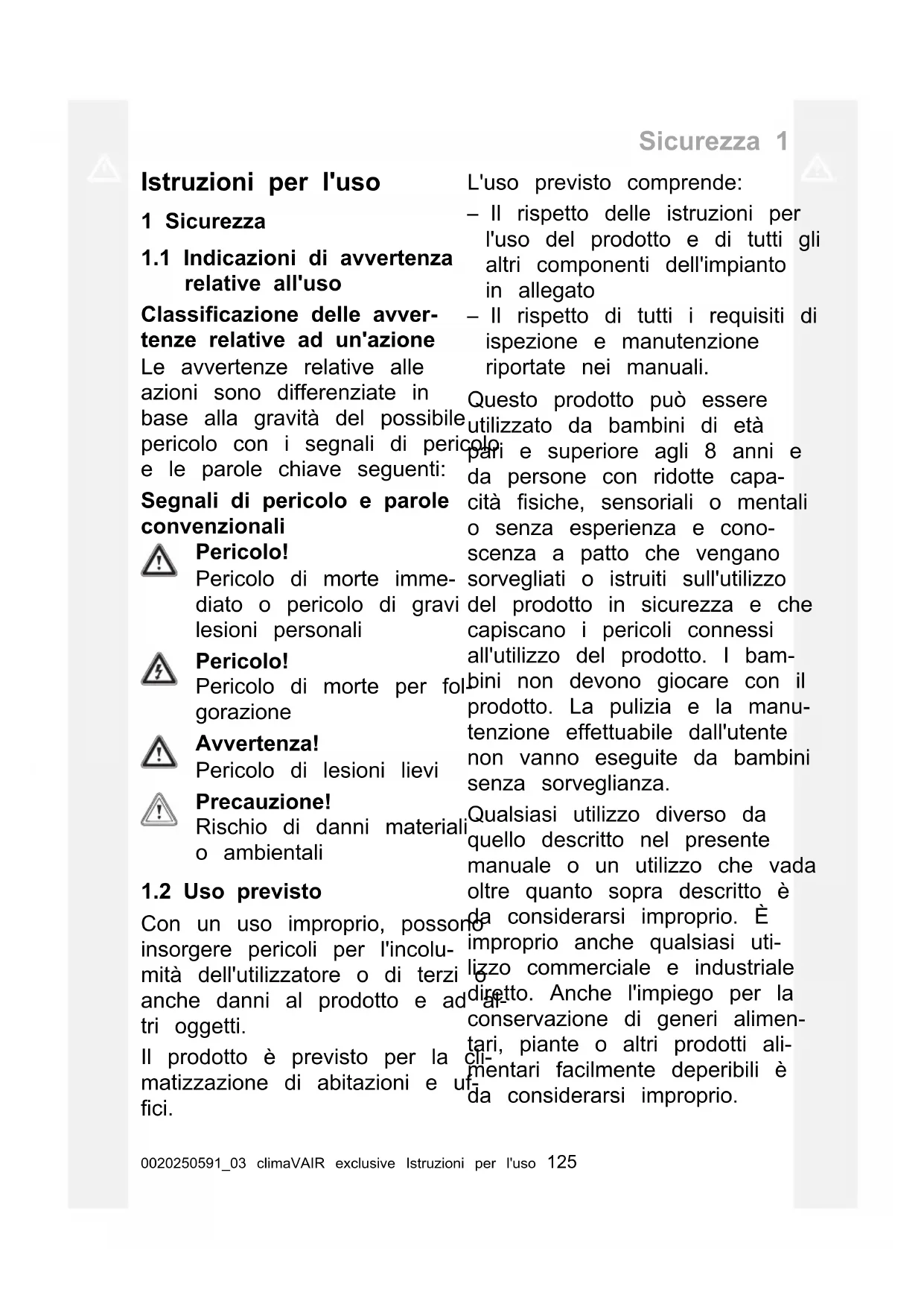 Con un uso improprio, possono insorgere pericoli per l'incolu- mità dell'utilizzatore o di terzi o anche danni al prodotto e ad al- tri oggetti. Il prodotto è previsto per la cli- matizzazione di abitazioni e uf- fici. L'uso previsto comprende: – Il rispetto delle istruzioni per l'uso del prodotto e di tutti gli altri componenti dell'impianto in allegato – Il rispetto di tutti i requisiti di ispezione e manutenzione riportate nei manuali. Questo prodotto può essere utilizzato da bambini di età pari e superiore agli 8 anni e da persone con ridotte capa- cità fisiche, sensoriali o mentali o senza esperienza e cono- scenza a patto che vengano sorvegliati o istruiti sull'utilizzo del prodotto in sicurezza e che capiscano i pericoli connessi all'utilizzo del prodotto. I bam- bini non devono giocare con il prodotto. La pulizia e la manu- tenzione effettuabile dall'utente non vanno eseguite da bambini senza sorveglianza. Qualsiasi utilizzo diverso da quello descritto nel presente manuale o un utilizzo che vada oltre quanto sopra descritto è da considerarsi improprio. È improprio anche qualsiasi uti- lizzo commerciale e industriale diretto. Anche l'impiego per la conservazione di generi alimen- tari, piante o altri prodotti ali- mentari facilmente deperibili è da considerarsi improprio.1 Sicurezza 126 Istruzioni per l'uso climaVAIR exclusive 0020250591_03 Attenzione! Ogni impiego improprio non è ammesso.