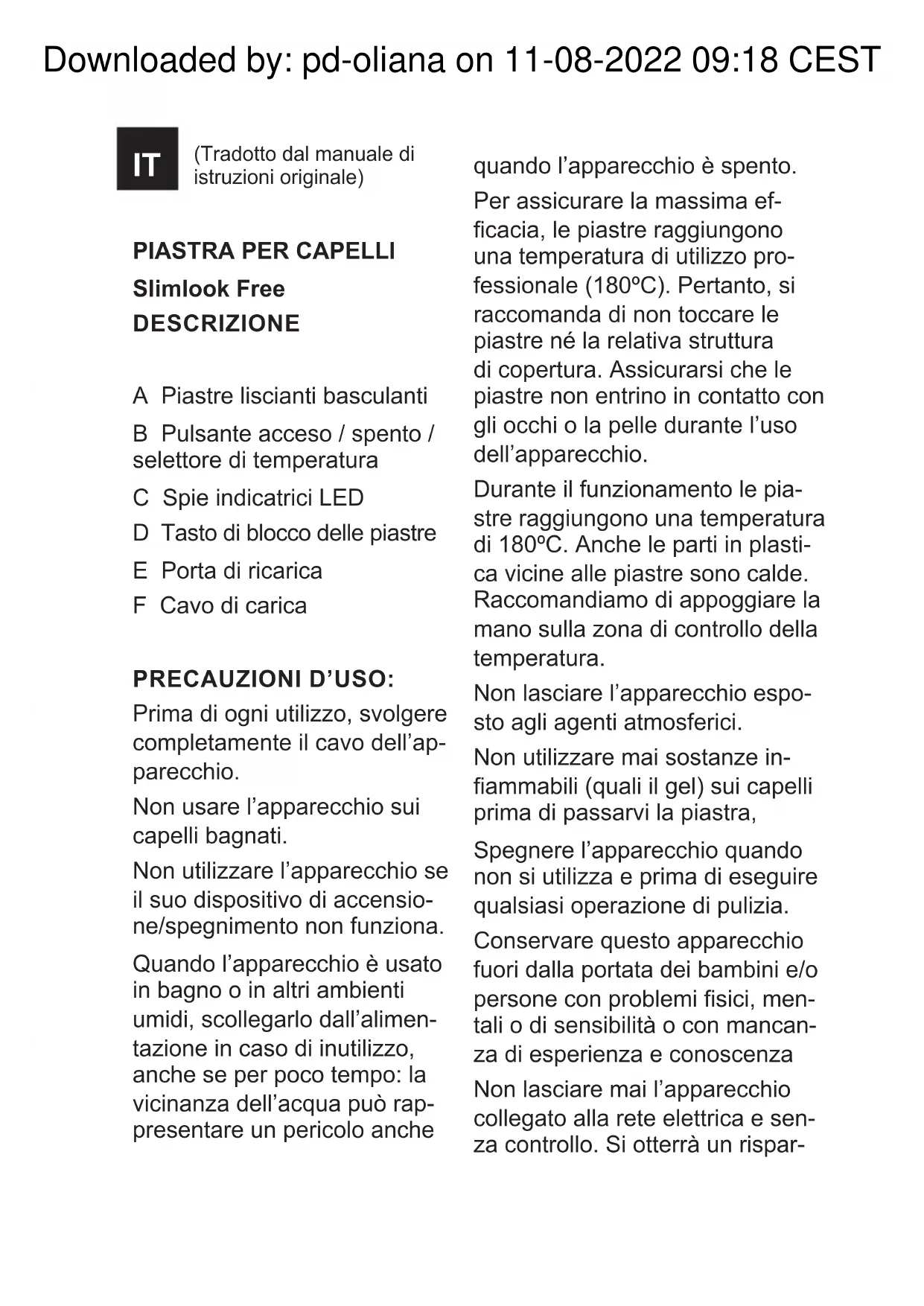 Slimlook Free DESCRIZIONE A Piastre liscianti basculanti B Pulsante acceso / spento / selettore di temperatura C Spie indicatrici LED D Tasto di blocco delle piastre E Porta di ricarica F Cavo di carica PRECAUZIONI D’USO: Prima di ogni utilizzo, svolgere completamente il cavo dell’ap- parecchio. Non usare l’apparecchio sui capelli bagnati. Non utilizzare l’apparecchio se il suo dispositivo di accensio- ne/spegnimento non funziona. Quando l’apparecchio è usato in bagno o in altri ambienti umidi, scollegarlo dall’alimen- tazione in caso di inutilizzo, anche se per poco tempo: la vicinanza dell’acqua può rap- presentare un pericolo anche quando l’apparecchio è spento. Per assicurare la massima ef- cacia, le piastre raggiungono una temperatura di utilizzo pro- fessionale (180ºC). Pertanto, si raccomanda di non toccare le piastre né la relativa struttura di copertura. Assicurarsi che le piastre non entrino in contatto con gli occhi o la pelle durante l’uso dell’apparecchio. Durante il funzionamento le pia- stre raggiungono una temperatura di 180ºC. Anche le parti in plasti- ca vicine alle piastre sono calde. Raccomandiamo di appoggiare la mano sulla zona di controllo della temperatura. Non lasciare l’apparecchio espo- sto agli agenti atmosferici. Non utilizzare mai sostanze in- ammabili (quali il gel) sui capelli prima di passarvi la piastra, Spegnere l’apparecchio quando non si utilizza e prima di eseguire qualsiasi operazione di pulizia. Conservare questo apparecchio fuori dalla portata dei bambini e/o persone con problemi sici, men- tali o di sensibilità o con mancan- za di esperienza e conoscenza Non lasciare mai l’apparecchio collegato alla rete elettrica e sen- za controllo. Si otterrà un rispar- (Tradotto dal manuale di istruzioni originale) Downloaded by: pd-oliana on 11-08-2022 09:18 CESTMODALITÀ D’USO PRIMA DELL’USO: Assicurarsi di aver rimosso dal prodotto tutto il materiale di imballaggio. L’apparecchio è progettato per modellare, arricciare, pettinare le punte verso l’interno e verso l’esterno, lisciare i capelli.