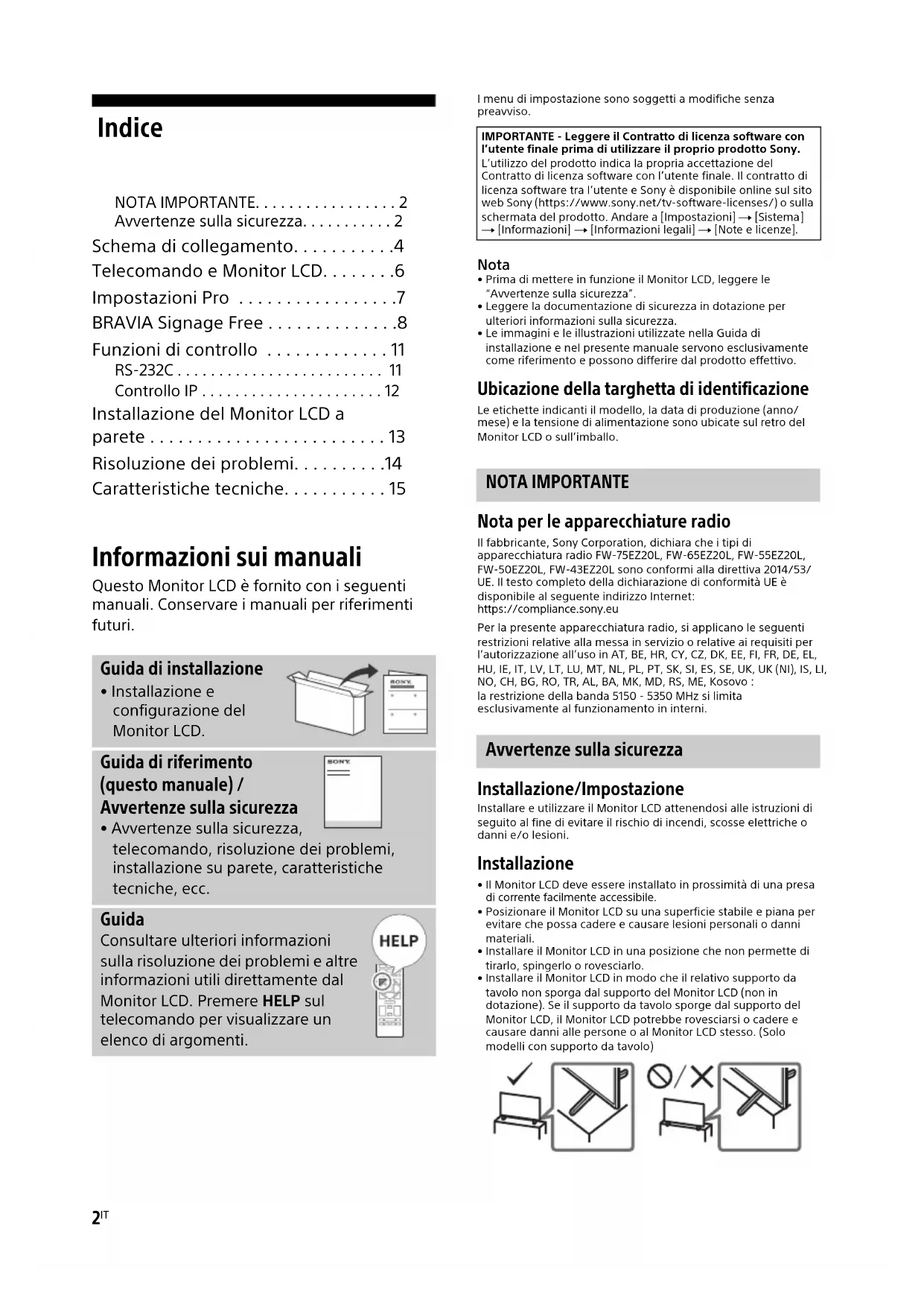 - Prima di mettere in funzione il Monitor LCD, leggere le “Avvertenze sulla sicurezza”.• Leggere la documentazione di sicurezza in dotazione per ulteriori informazioni sulla sicurezza.• Le immagini e le illustrazioni utilizzate nella Guida di installazione e nel presente manuale servono esclusivamente come riferimento e possono differire dal prodotto effettivo. Ubicazione della targhetta di identificazione Le etichette indicanti il modello, la data di produzione (anno/ mese) e la tensione di alimentazione sono ubicate sul retro del Monitor LCD o sull’imballo. Nota per le apparecchiature radio Il fabbricante, Sony Corporation, dichiara che i tipi di apparecchiatura radio FW-75EZ20L, FW-65EZ20L, FW-55EZ20L, FW-50EZ20L, FW-43EZ20L sono conformi alla direttiva 2014/53/UE. Il testo completo della dichiarazione di conformità UE è disponibile al seguente indirizzo Internet: https://compliance.sony.euPer la presente apparecchiatura radio, si applicano le seguenti restrizioni relative alla messa in servizio o relative ai requisiti per l’autorizzazione all’uso in AT, BE, HR, CY, CZ, DK, EE, FI, FR, DE, EL, HU, IE, IT, LV, LT, LU, MT, NL, PL, PT, SK, SI, ES, SE, UK, UK (NI), IS, LI, NO, CH, BG, RO, TR, AL, BA, MK, MD, RS, ME, Kosovo :la restrizione della banda 5150 - 5350 MHz si limita esclusivamente al funzionamento in interni. Installazione/Impostazione Installare e utilizzare il Monitor LCD attenendosi alle istruzioni di seguito al fine di evitare il rischio di incendi, scosse elettriche o danni e/o lesioni. Installazione