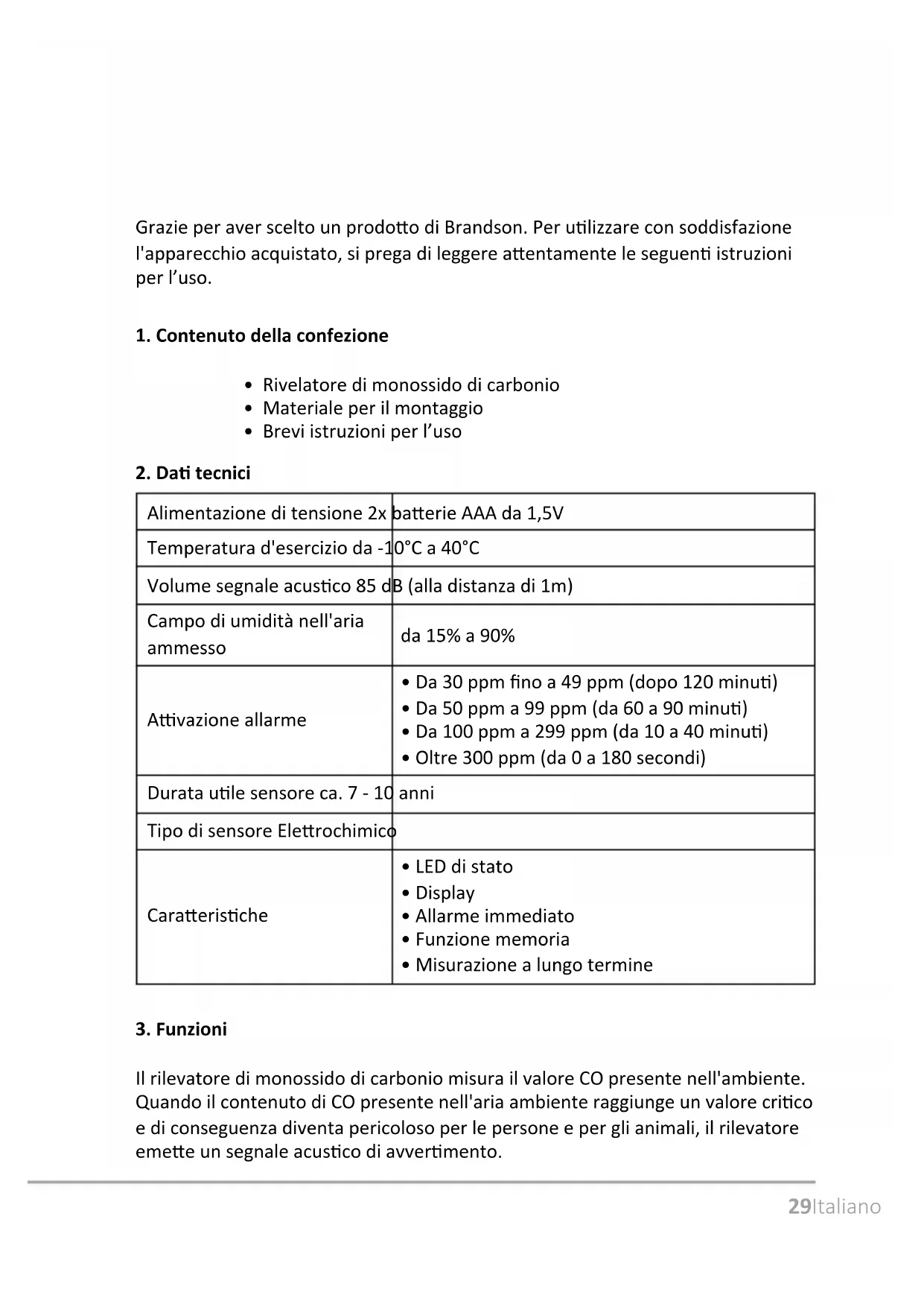 Il rilevatore di monossido di carbonio è destinato esclusivamente ad ambienti interni. Non esporre l'apparecchio a umilità o pioggia.