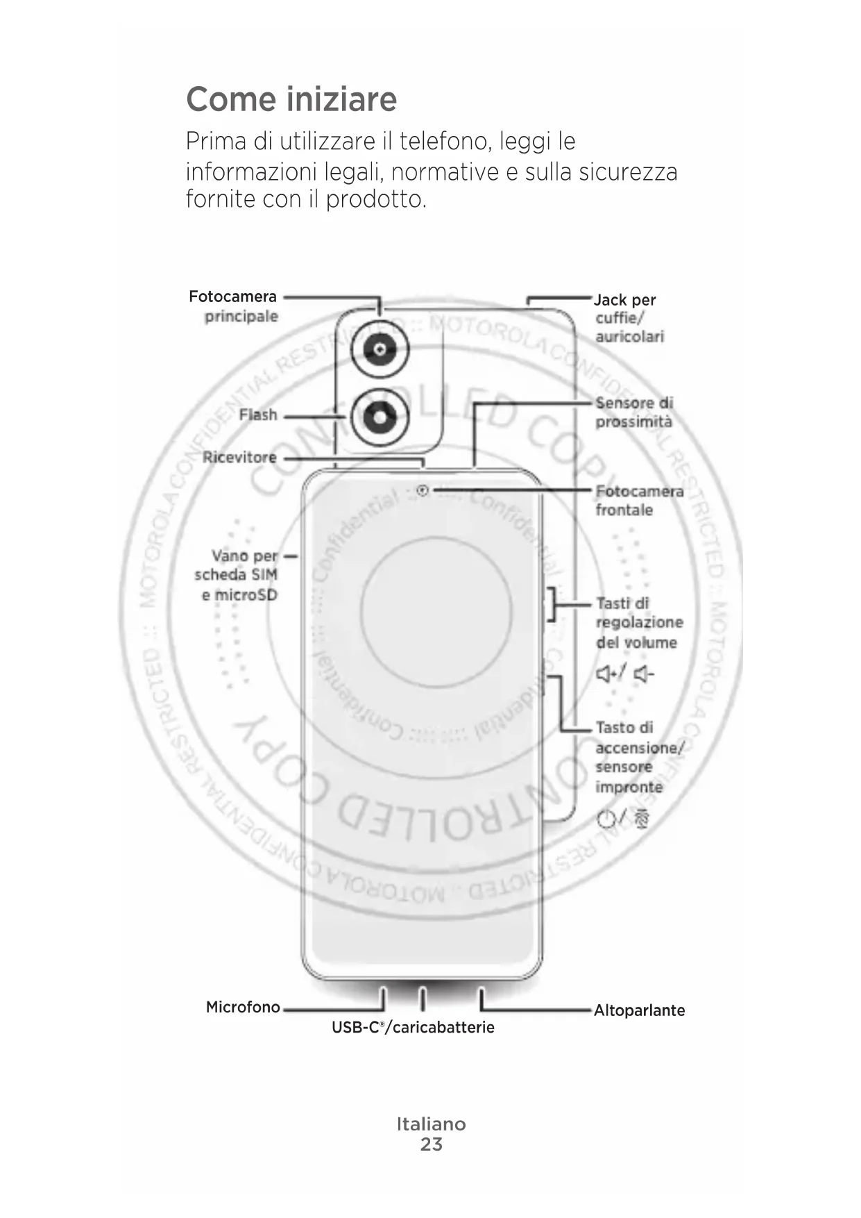 - Download delle app: tocca Play Store per cercare e scaricare le applicazioni. Informazioni legali. La presente guida fornisce importanti informazioni legali, normative e sulla sicurezza che occorre leggere prima di utilizzare il prodotto. Per consultare il documento completo contenente le informazioni legali, scorri verso l'alto nella schermata Home e tocca Impostazioni > , quindi digita Informazioni legali, oppure visita il sito www.motorola.com/device-legal. Resistenza all'acqua. Il telefono non è impermeabile. Per ulteriori informazioni sul design idrorepellente del telefono e sulla sua manutenzione, scorri verso l'alto e tocca Impostazioni > Guida. Sicurezza relativa alle operazioni di ricarica e alla batteria. Per evitare possibili scottature e lesioni, la batteria del telefono dovrebbe essere rimossa solo presso un centro di assistenza autorizzato Motorola o da altro personale qualificato. Se il telefono non risponde ai comandi, tieni premuto il tasto di accensione finché lo schermo non si spegne e il telefono non si riavvia. Carica il telefono utilizzando un caricabatteria Motorola compatibile (potrebbe essere venduto separatamente). L'uso di altri tipi di caricabatteria non è consigliato e potrebbe influire sulle corrette prestazioni di ricarica. Non ricaricare il telefono a temperature inferiori a -20 °C (-4 °F) e superiori a 45 °C (113 °F). I caricabatteria non conformi agli standard nazionali applicabili possono essere pericolosi, comportare rischi di ferite o morte, ricaricare il dispositivo lentamente o danneggiare il prodotto. Per visualizzare gli standard applicabili e ottenere ulteriori informazioni, consulta la sezione "Informazioni legali" di questa guida, oppure visita la pagina www.motorola.com/device-legal. Avviso sull'utilizzo a livelli di volume elevati. Per evitare possibili danni all'udito, non ascoltare ad alto volume per periodi prolungati. Quando il volume delle cue/auricolari raggiunge la soglia di volume alto, viene visualizzato un avviso. Tocca OK per ignorarlo oppure attendi cinque secondi, quindi premi il tasto di aumento del volume per chiudere l'avviso e continuare a regolare il volume. Smaltimento e riciclaggio. Per informazioni su come riciclare i prodotti e le confezioni in modo responsabile, visita la pagina www.motorola.com/recycling. Temperature eccessivamente alte o basse. Non utilizzare il telefono a temperature inferiori a -20 °C (-4 °F) e superiori a 45 °C (113 °F). Non conservare/trasportare il telefono a temperature inferiori a26 -20 °C (-4 °F) o superiori a 60 °C (140 °F). Dichiarazioni legali di non responsabilità. Funzioni, servizi e applicazioni dipendono dalla rete e potrebbero non essere disponibili in tutti i Paesi; potrebbero essere applicati ulteriori termini e/o costi aggiuntivi. Le specifiche del prodotto e altre informazioni presenti in questa guida sono ritenute accurate al momento della stampa. Motorola si riserva il diritto di correggere o modificare qualsiasi informazione senza preavviso. Arbitrato. L'acquisto è regolato da una clausola arbitrale vincolante. Per ulteriori informazioni e per sapere come recedere, consulta il manuale legale fornito con il telefono. Informazioni SAR (sull'etichetta elettronica). Per visualizzare i valori sul tasso di assorbimento specifico (SAR) per questo telefono, scorri verso l'alto nella schermata Home e tocca Impostazioni >