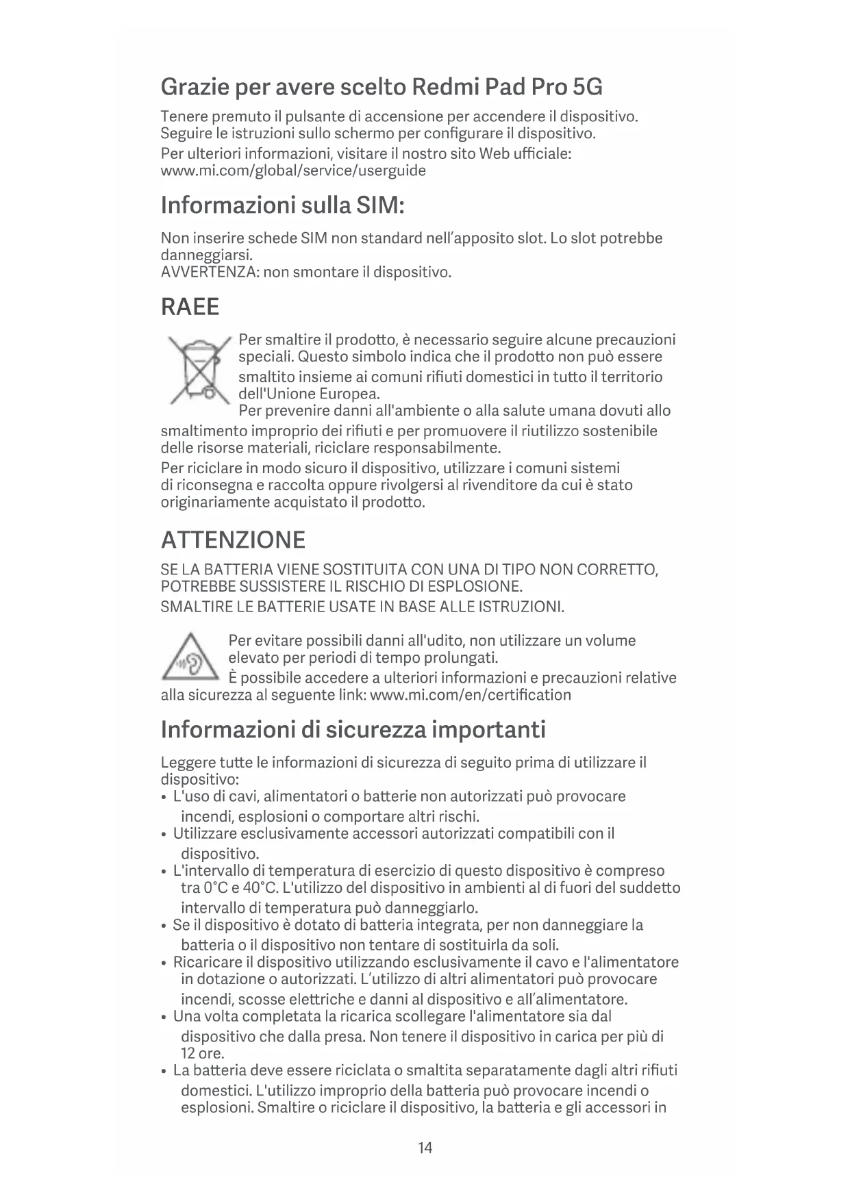 Nano SIM Nano SIM Nano SIM Micro SD 13Grazie per avere scelto Redmi Pad Pro 5G Tenere premuto il pulsante di accensione per accendere il dispositivo. Seguire le istruzioni sullo schermo per configurare il dispositivo. Per ulteriori informazioni, visitare il nostro sito Web ufficiale: www.mi.com/global/service/userguide Informazioni sulla SIM: Non inserire schede SIM non standard nell’apposito slot. Lo slot potrebbe danneggiarsi. AVVERTENZA: non smontare il dispositivo. RAEE Per smaltire il prodoo, è necessario seguire alcune precauzioni speciali. Questo simbolo indica che il prodoo non può essere smaltito insieme ai comuni rifiuti domestici in tuo il territorio dell'Unione Europea. Per prevenire danni all'ambiente o alla salute umana dovuti allo smaltimento improprio dei rifiuti e per promuovere il riutilizzo sostenibile delle risorse materiali, riciclare responsabilmente. Per riciclare in modo sicuro il dispositivo, utilizzare i comuni sistemi di riconsegna e raccolta oppure rivolgersi al rivenditore da cui è stato originariamente acquistato il prodoo. ATTENZIONE SE LA BATTERIA VIENE SOSTITUITA CON UNA DI TIPO NON CORRETTO, POTREBBE SUSSISTERE IL RISCHIO DI ESPLOSIONE. SMALTIRE LE BATTERIE USATE IN BASE ALLE ISTRUZIONI. Per evitare possibili danni all'udito, non utilizzare un volume elevato per periodi di tempo prolungati. È possibile accedere a ulteriori informazioni e precauzioni relative alla sicurezza al seguente link: www.mi.com/en/certification Informazioni di sicurezza importanti Leggere tue le informazioni di sicurezza di seguito prima di utilizzare il dispositivo: