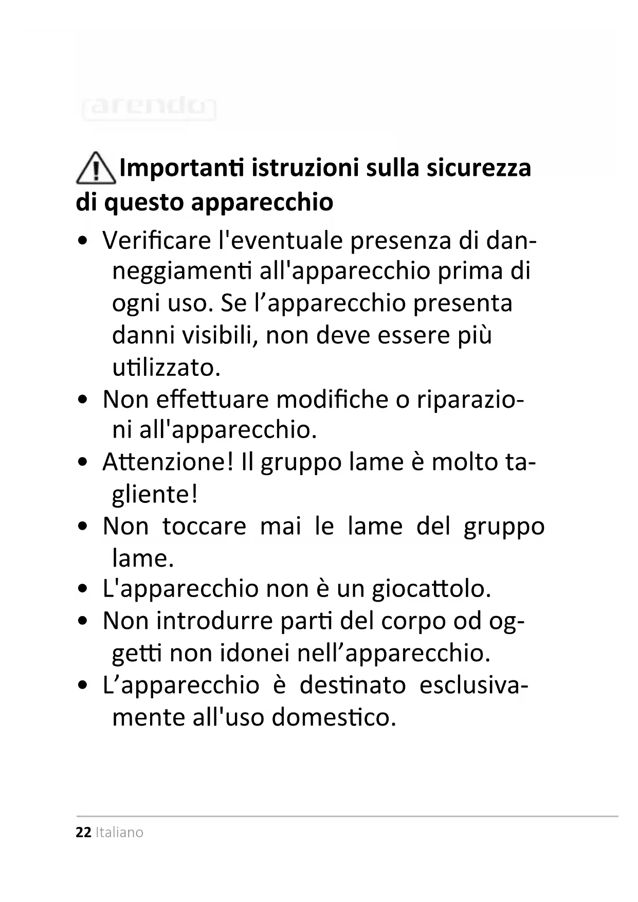 Grazie per aver scelto un prodotto di Arendo. Per utilizzare con soddisfazione l'apparecchio acquistato, si prega di leggere attentamente le seguenti istruzioni per l'uso. Prima della messa in funzione della merce consegnata, verificare che sia integra, esente da difetti e non danneggiata.