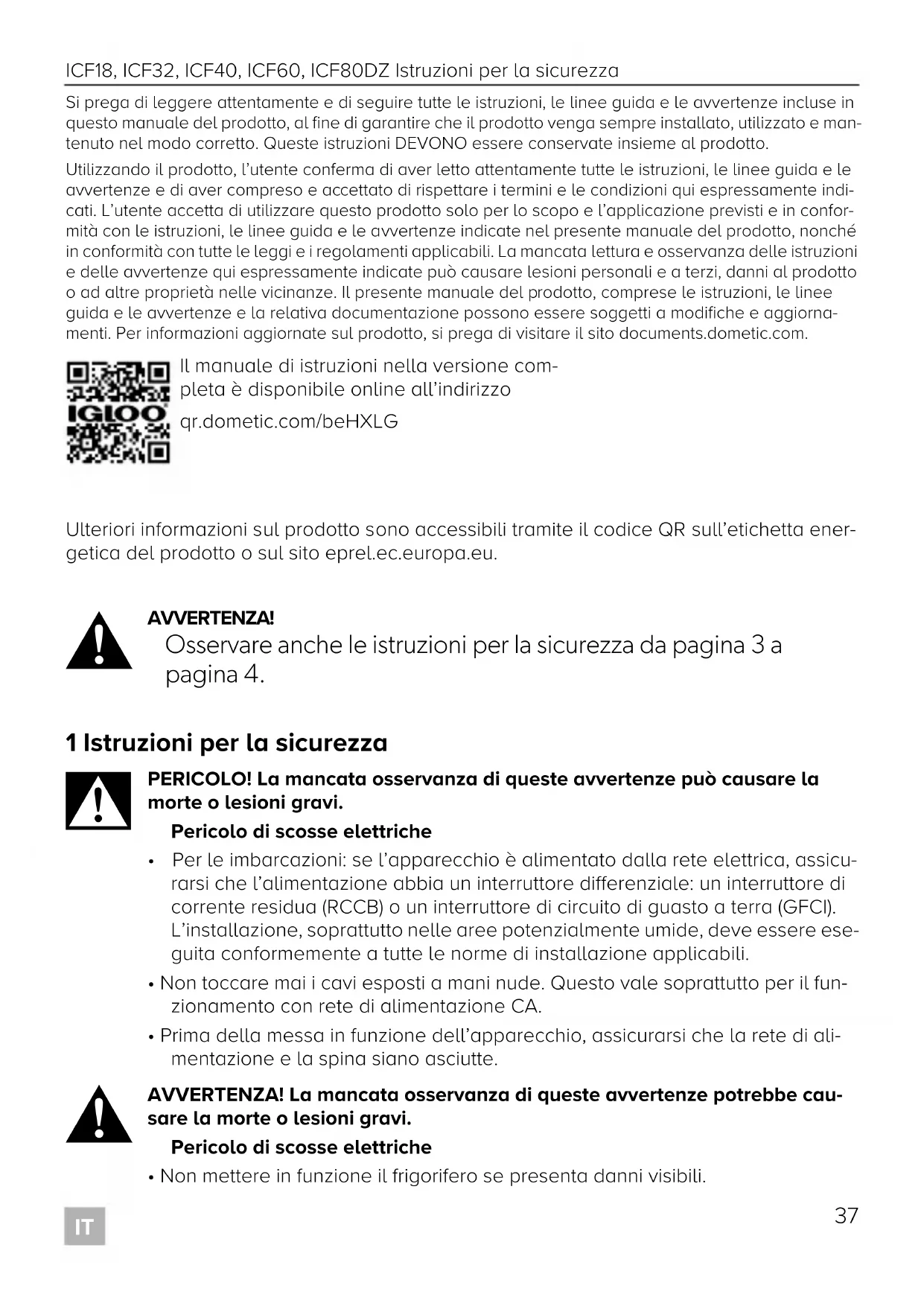 - Non mettere in funzione il frigorifero se presenta danni visibili. Il manuale di istruzioni nella versione com- pleta è disponibile online all’indirizzo qr.dometic.com/beHXLG Igloo ICF18, ICF32, ICF40, ICF60, ICF80DZ_ SOM_4445103836_ EMEA24-ar _202x-xx-xx.book Page 37 Friday, September 15, 2023 12:50 PMIstruzioni per la sicurezza ICF18, ICF32, ICF40, ICF60, ICF80DZ