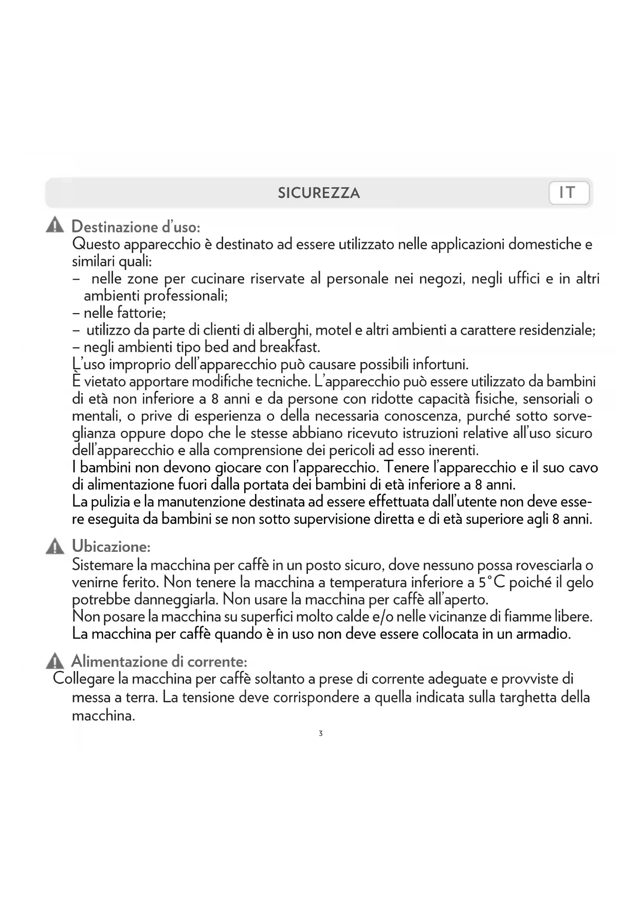 Collegare la macchina per caffe sostanto a prese di corrente adeguate e provviste di messa a terra. La tension deve corrispondere a quella indicata sulla targhetto della macchina.