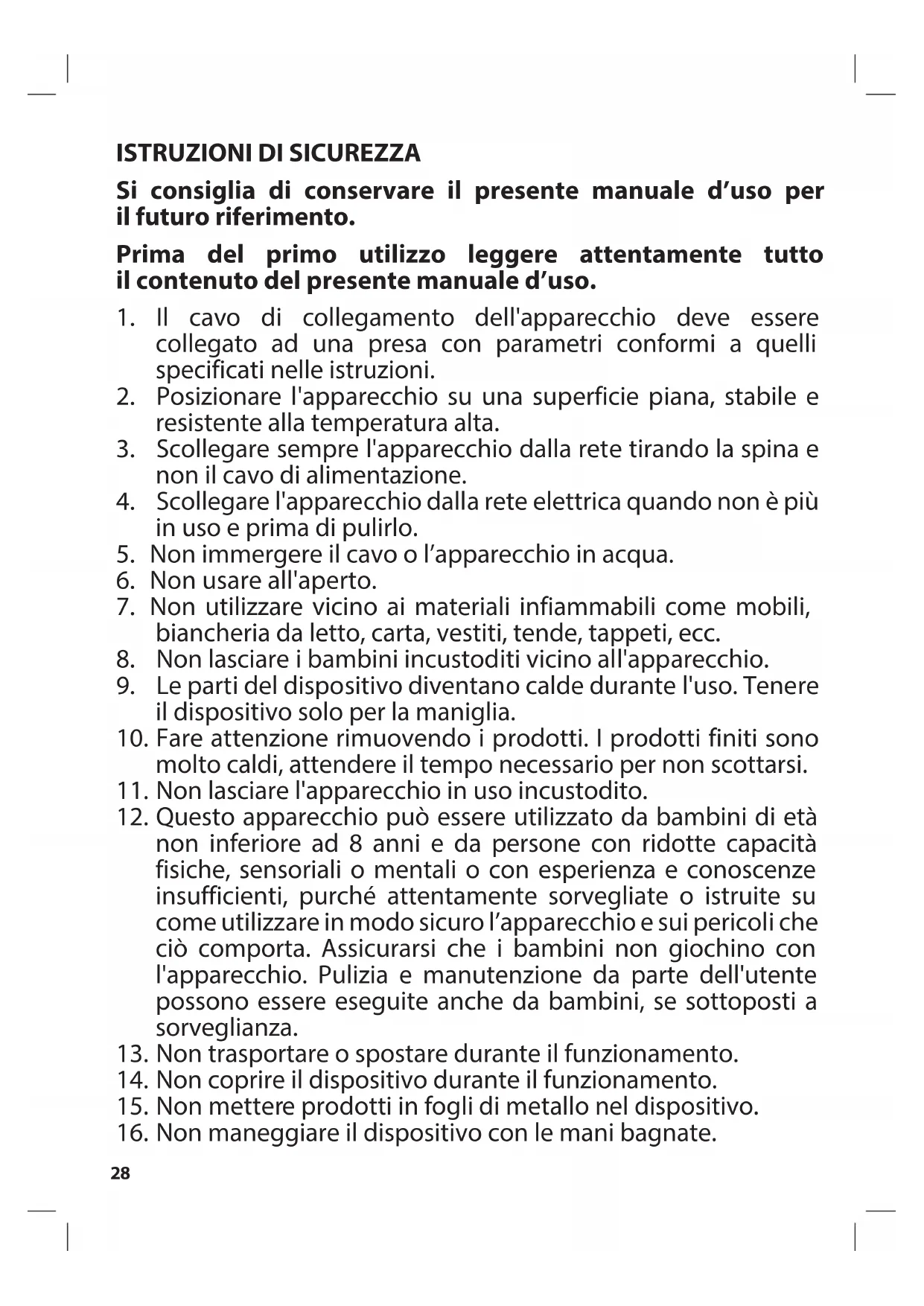 - GARANZIA − Questo prodotto è stato concepito per il solo uso domestico, in privato. − Non deve essere usato per scopi professionali. − La garanzia garanzia decade in caso di trattamento improprio.29