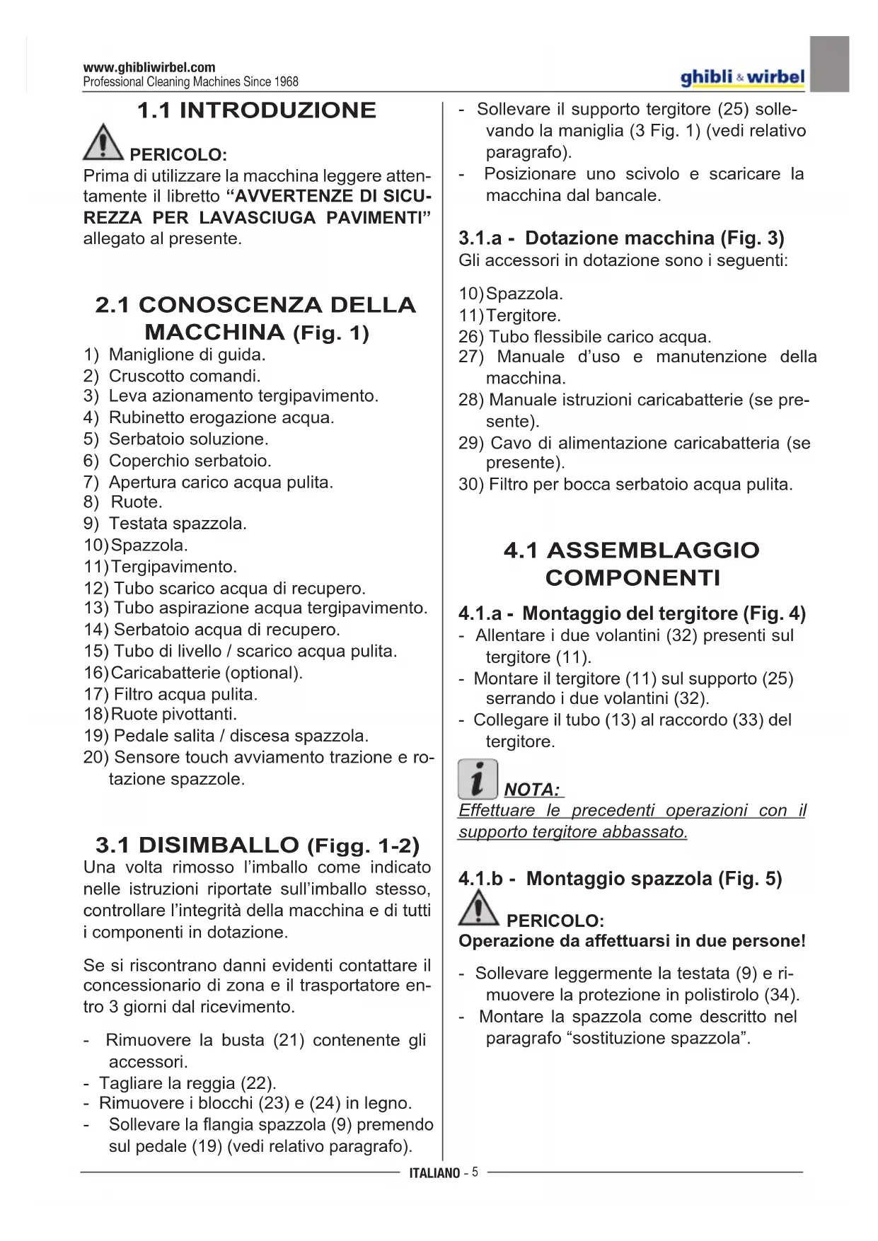 PERICOLO: Operazione da affettuarsi in due persone! - Sollevare leggermente la testata (9) e ri- muovere la protezione in polistirolo (34). - Montare la spazzola come descritto nel paragrafo “sostituzione spazzola”. Man_FR30SM45TOUCH_49026500_1ed_02-2018_10L.indd 5 02/03/18 08:56www.ghibliwirbel.com Professional Cleaning Machines Since 1968 ITALIANO -