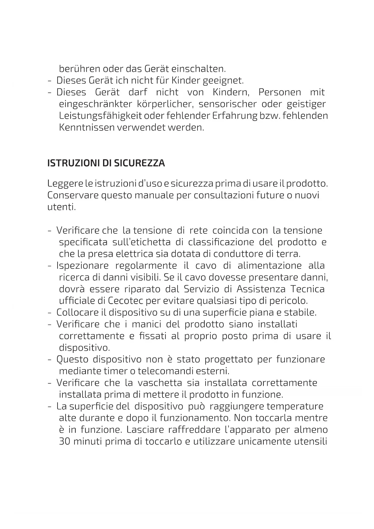 Leggere le istruzioni d’uso e sicurezza prima di usare il prodotto. Conservare questo manuale per consultazioni future o nuovi utenti. - Vericare che la tensione di rete coincida con la tensione specicata sull’etichetta di classicazione del prodotto e che la presa elettrica sia dotata di conduttore di terra. - Ispezionare regolarmente il cavo di alimentazione alla ricerca di danni visibili. Se il cavo dovesse presentare danni, dovrà essere riparato dal Servizio di Assistenza Tecnica ufciale di Cecotec per evitare qualsiasi tipo di pericolo. - Collocare il dispositivo su di una supercie piana e stabile. - Vericare che i manici del prodotto siano installati correttamente e ssati al proprio posto prima di usare il dispositivo. - Questo dispositivo non è stato progettato per funzionare mediante timer o telecomandi esterni. - Vericare che la vaschetta sia installata correttamente installata prima di mettere il prodotto in funzione. - La supercie del dispositivo può raggiungere temperature alte durante e dopo il funzionamento. Non toccarla mentre è in funzione. Lasciare raffreddare l’apparato per almeno 30 minuti prima di toccarlo e utilizzare unicamente utensiliresistenti al calore. Non utilizzare utensili di metallo, dato che potrebbero raggiungere temperature alte. - Scollegare sempre il dispositivo quando non si sta utilizzando, prima di pulirlo e prima di effettuare qualsiasi tipo di manutenzione. - Le componenti elettriche dispongono di un sistema di sicurezza che assicura che le resistenze possono mettersi in funzionamento solamente se correttamente installate. - In caso di surriscaldamento, l’elemento di protezione termica spegnerà automaticamente la friggitrice. Questo elemento si può riattivare utilizzando un elemento appuntito (come la punta di una penna) per premere il tasto situato nella parte posteriore dello scomparto avvolgi-cavo, segnato con “Restart”. Prima di riattivarlo, scollegare il dispositivo dalla corrente e attendere che si raffreddi. - L’uso di accessori o parti non fornite o suggerite da Cecotec potrebbe provocare incendi, scariche elettriche o danni sia a persone che al prodotto. - Non lasciare che il cavo sporga sul bordo della supercie da lavoro o banco da cucina, nè che entri a contatto con superci calde. - Non utilizzare il prodotto all’esterno, vicino a piastree elettriche o a gas, amme o dentro forni. - Eccedere nella precauzione quando si spostano dispositivi che contengono olio o altri liquidi caldi. Non muovere il dispositivo mentre è in funzionamento. - Asciugare l’eccesso umidità dal cibo prima di friggerlo per evitare che l’olio emetta fumo entrando a contatto. - Non lasciare il prodotto senza supervisione durante il suo funzionamento. - Coprire il dispositivo o metterlo a contatto con materiale inammabile come tende, pareti o simii durante ilfunzionamento potrebbe causare incendi. Non collocare nessun oggetto sopra il prodotto quando si sta utilizzando. - Non tirare il cavo di alimentazione per scollegare il dispositivo, bensì, tirare la spina. - Vericare che il livello d’olio si trovi tra i livelli di massimo e minimo dentro la vaschetta. - Non collegare la friggitrice prima di riempirla d’olio o grasso, ciò potrebbe danneggiare il prodotto e provocare un’interruzione del rifornimento elettrico. - Supervisionare i bambini per assicurarsi che non giochino con il prodotto. - Questo dispositivo è stato progettato unicamente per uso domestico, non utilizzare per ni commerciali o industriali. - Non esporre né sommergere il cavo, la spina, le componenti elettriche, né qualsiasi altra parte non estraibile del prodotto all’acqua o altri liquidi. Vericare di avere le mani completamente asciutte prima di toccare la spina o accendere il prodotto. - Questo dispositivo non è adatto ai bambini. - Questo prodotto non è adatto a persone con capacità siche, sensoriali o mentali ridotte, o con mancanza di esperienza e conoscenza.