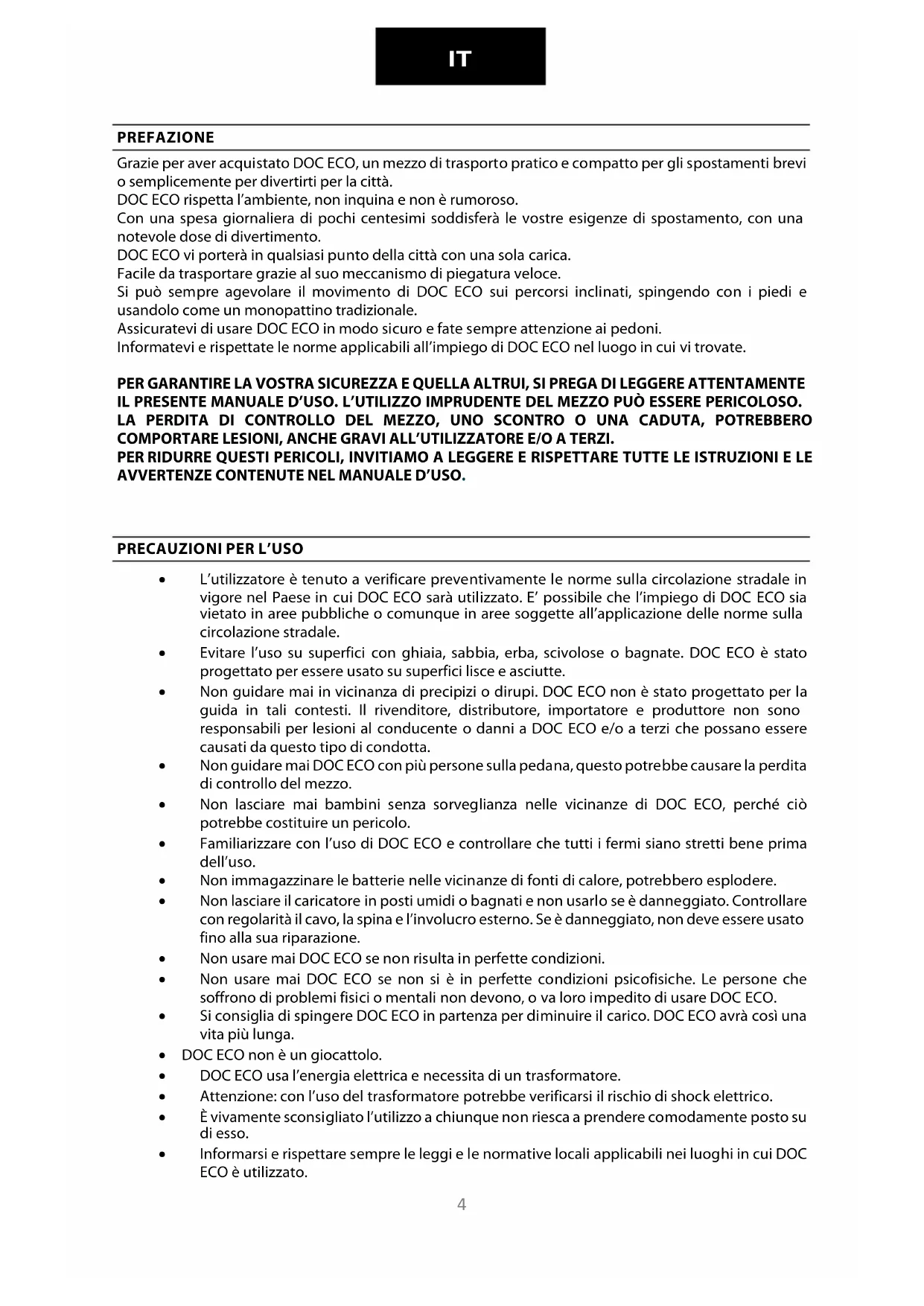 Seguire attentamente le seguenti avvertenze d’uso. Utilizzare DOC ECO in modo consapevole e responsabile. DOC ECO è un mezzo di trasporto ad altissima tecnologia, ma il suo utilizzo scorretto o non idoneo possono causare lesioni. Al fine di ridurre al minimo rischi di ogni tipo si consiglia di seguire attentamente le seguenti avvertenze: