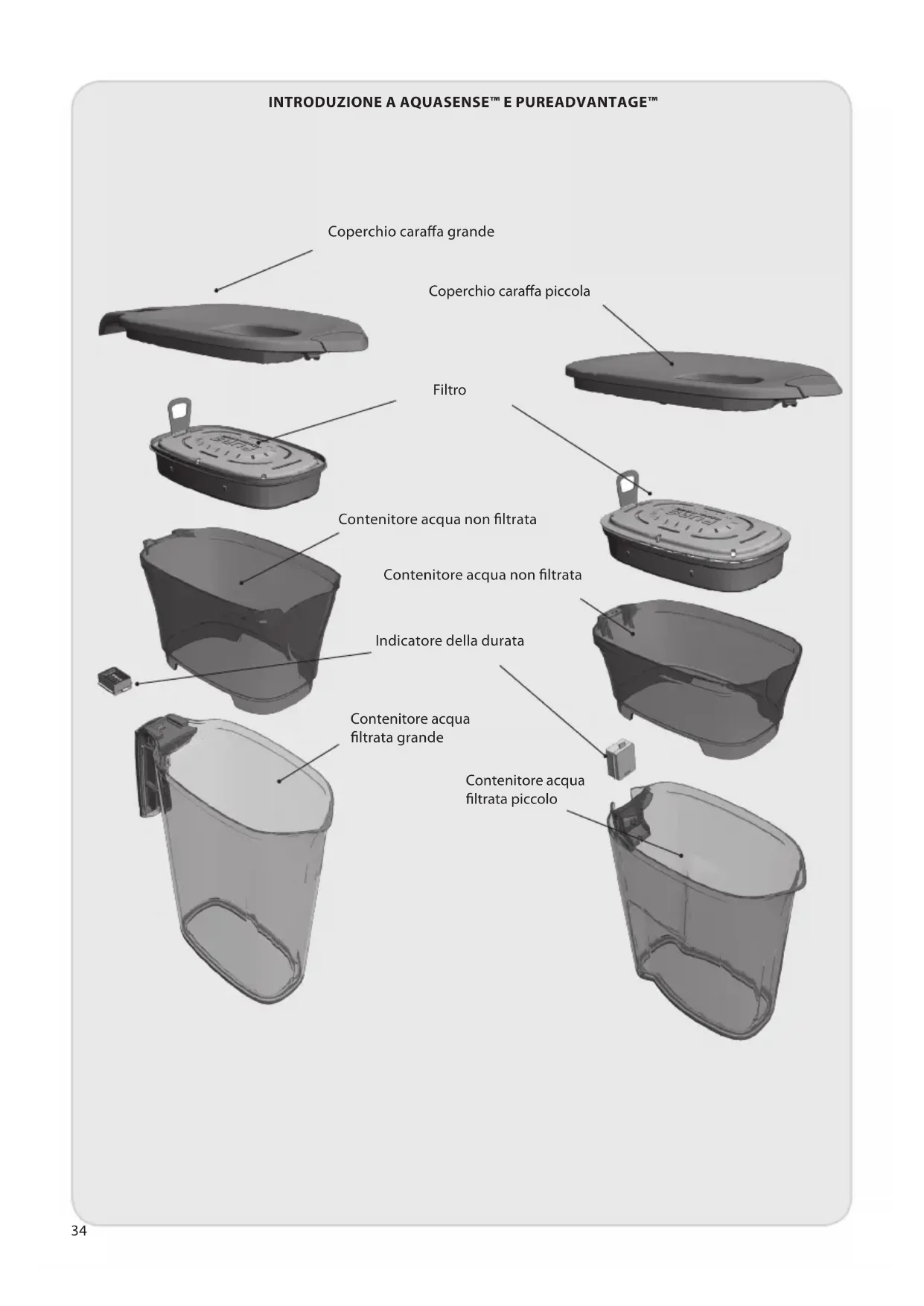 Coperchio caraa grande Coperchio caraa piccola Filtro Contenitore acqua non ltrata Contenitore acqua non ltrata Contenitore acqua ltrata grande Contenitore acqua ltrata piccolo Indicatore della durata35 Deutsch English Dansk Norsk Svenska Suomi Nederlands Français Italiano Español Português Ελληνικά Türkçe Grazie per aver scelto AEG AquaSense™ con la tecnologia di ltraggio PUREADVANTAGE™