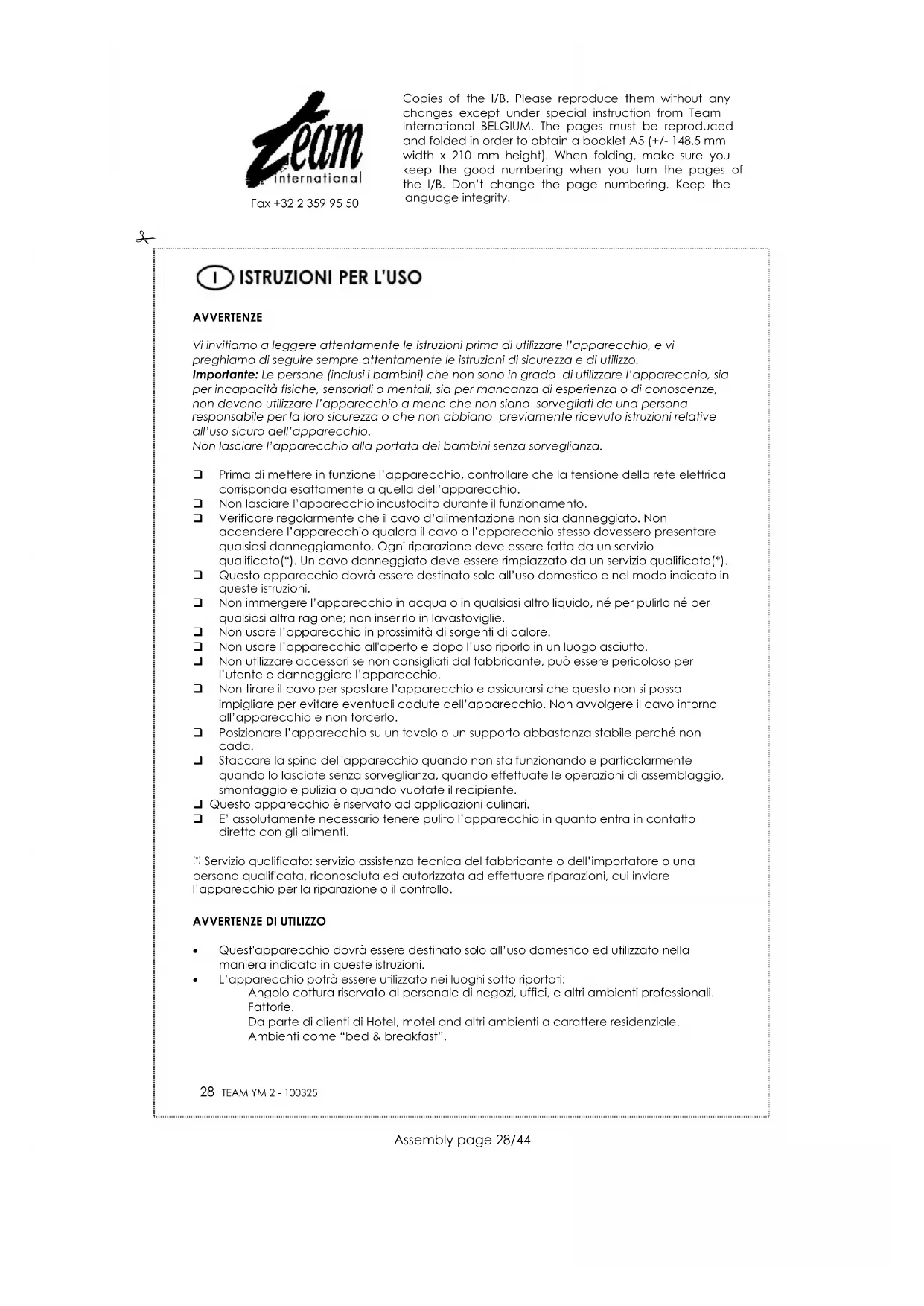 Quest'apparecchio dovrà essere destinato solo all’uso domestico ed utilizzato nella maniera indicata in queste istruzioni. L’apparecchio potrà essere utilizzato nei luoghi sotto riportati: Angolo cottura riservato al personale di negozi, uffici, e altri ambienti professionali. Fattorie. Da parte di clienti di Hotel, motel and altri ambienti a carattere residenziale. Ambienti come “bed & breakfast”. Copies of the I/B. Please reproduce them without any changes except under special instruction from Team International BELGIUM. The pages must be reproduced and folded in order to obtain a booklet A5 (+/- 148.5 mm width x 210 mm height). When folding, make sure you keep the good numbering when you turn the pages of the I/B. Don’t change the page numbering. Keep the language integrity.
