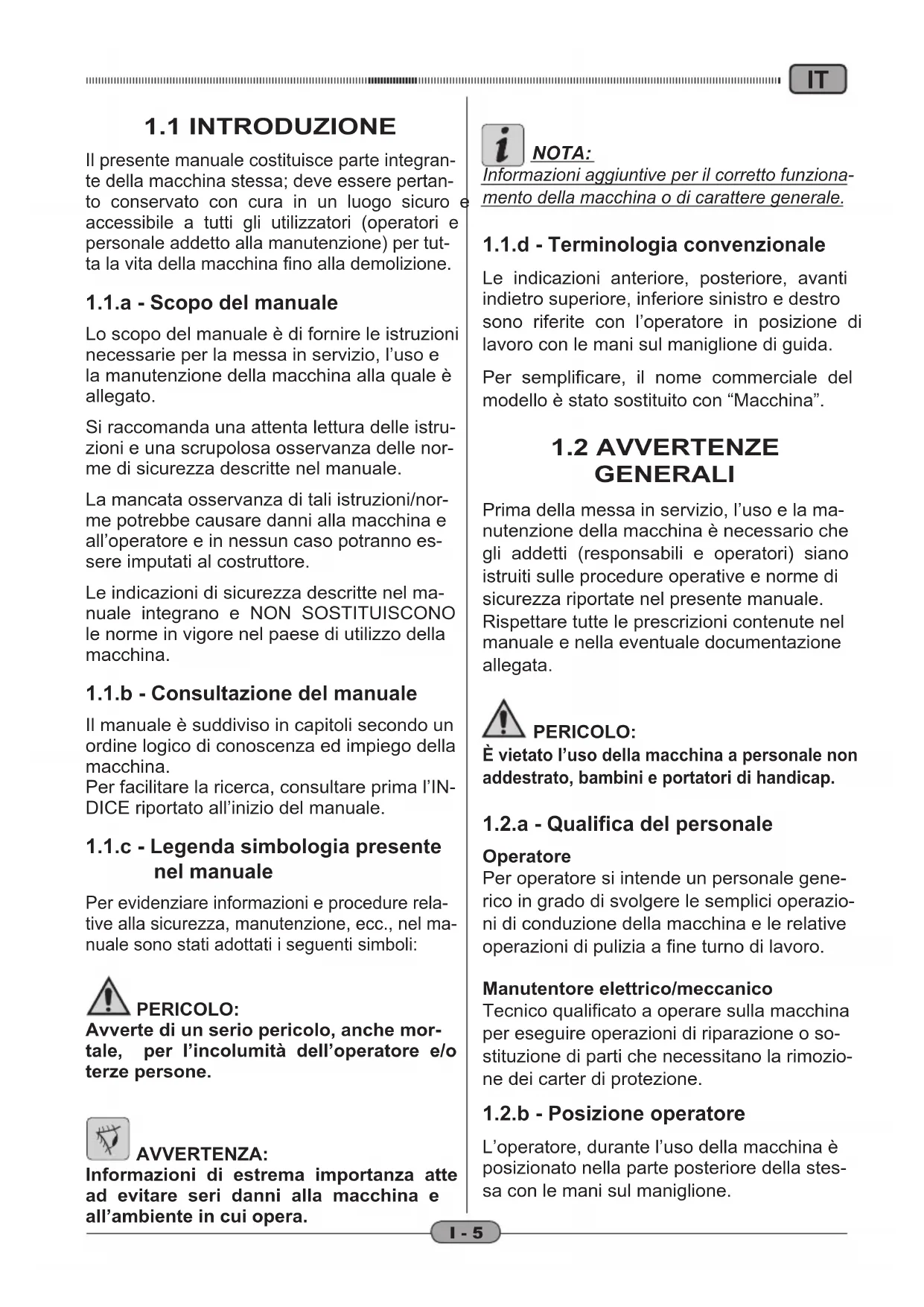 GENERALI Prima della messa in servizio, l’uso e la ma- nutenzione della macchina è necessario che gli addetti (responsabili e operatori) siano istruiti sulle procedure operative e norme di sicurezza riportate nel presente manuale. Rispettare tutte le prescrizioni contenute nel manuale e nella eventuale documentazione allegata. PERICOLO: È vietato l’uso della macchina a personale non addestrato, bambini e portatori di handicap.