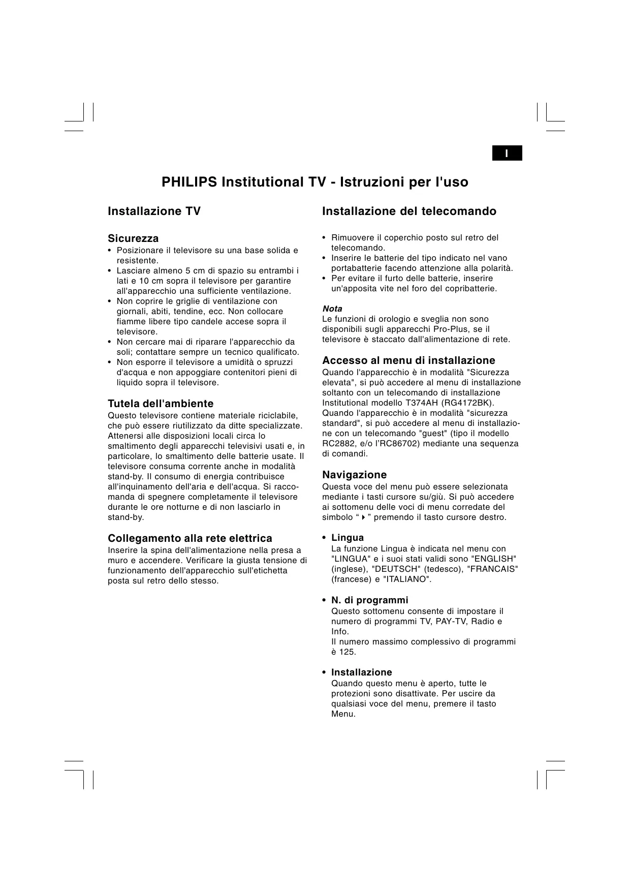 - Non esporre il televisore a umidità o spruzzi d'acqua e non appoggiare contenitori pieni di liquido sopra il televisore. Tutela dell'ambiente Questo televisore contiene materiale riciclabile, che può essere riutilizzato da ditte specializzate. Attenersi alle disposizioni locali circa lo smaltimento degli apparecchi televisivi usati e, in particolare, lo smaltimento delle batterie usate. Il televisore consuma corrente anche in modalità stand-by. Il consumo di energia contribuisce all'inquinamento dell'aria e dell'acqua. Si raccomanda di spegnere completamente il televisore durante le ore notturne e di non lasciarlo in stand-by. Collegamento alla rete elettrica Inserire la spina dell'alimentazione nella presa a muro e accendere. Verificare la giusta tensione di funzionamento dell'apparecchio sull'etichetta posta sul retro dello stesso. Nota Le funzioni di orologio e sveglia non sono disponibili sugli apparecchi Pro-Plus, se il televisore è staccato dall'alimentazione di rete. Accesso al menu di installazione Quando l'apparecchio è in modalità "Sicurezza elevata", si può accedere al menu di installazione soltanto con un telecomando di installazione Institutional modello T374AH (RG4172BK). Quando l'apparecchio è in modalità "sicurezza standard", si può accedere al menu di installazione con un telecomando "guest" (tipo il modello RC2882, e/o l’RC86702) mediante una sequenza di comandi. Navigazione Questa voce del menu può essere selezionata mediante i tasti cursore su/giù. Si può accedere ai sottomenu delle voci di menu corredate del simbolo “"” premendo il tasto cursore destro.