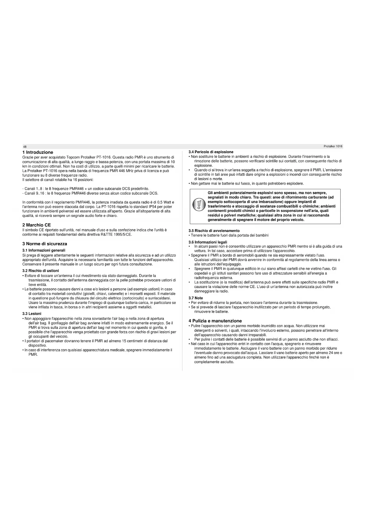 Takuu ei korvaa vääränlaisesta käsittelystä tai käytöstä johtuvia vaurioita eikä vaurioita, jotka johtuvat muiden kuin alkuperäisten osien tai lisälaitteiden käytöstä. Takuu ei korvaa ulkopuolisten tekijöiden, kuten salama-, vesi- tai palovahinkojen aiheuttamia vaurioita eikä kuljetuksen aikana aiheutuneita vaurioita. Takuu ei ole voimassa, jos laitteen sarjanumero on muutettu, poistettu tai tehty lukukelvottomaksi. Takuu raukeaa, jos ostaja on korjannut, muuttanut tai muunnellut laitetta. Kuva Liitteessä B osoittaa, kuinka kaiutin/mikrofoni liitetään.48 Protalker 1016 1 Introduzione Grazie per aver acquistato Topcom Protalker PT-1016. Questa radio PMR è uno strumento di comunicazione di alta qualità, a lungo raggio e bassa potenza, con una portata massima di 10 km in condizioni ottimali. Non ha costi di utilizzo, a parte quelli minimi per ricaricare le batterie. La Protalker PT-1016 opera nella banda di frequenza PMR 446 MHz priva di licenza e può funzionare su 8 diverse frequenze radio. Il selettore di canali rotabile ha 16 posizioni: - Canali 1..8 : le 8 frequenze PMR446 + un codice subcanale DCS predefinito. - Canali 9..16 : le 8 frequenze PMR446 diverse senza alcun codice subcanale DCS. In conformità con il regolamento PMR446, la potenza irradiata da questa radio è di 0,5 Watt e l'antenna non può essere staccata dal corpo. La PT-1016 rispetta lo standard IP54 per poter funzionare in ambienti polverosi ed essere utilizzata all'aperto. Grazie all'altoparlante di alta qualità, si riceverà sempre un segnale audio forte e chiaro. 2 Marchio CE Il simbolo CE riportato sull'unità, nel manuale d'uso e sulla confezione indica che l'unità è conforme ai requisiti fondamentali della direttiva R&TTE 1995/5/CE. 3 Norme di sicurezza