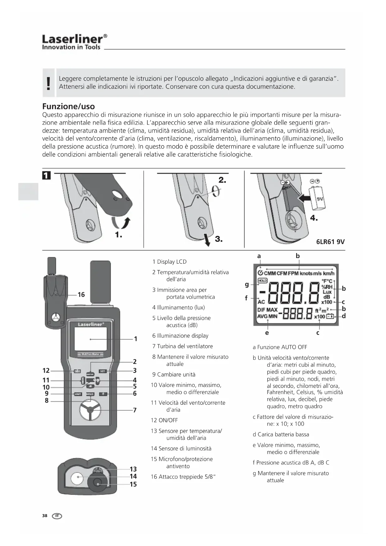 1 Display LCD 2 Temperatura/umidità relativa dell‘aria 3 Immissione area per portata volumetrica 4 Illuminamento (lux) 5 Livello della pressione acustica (dB) 6 Illuminazione display 7 Turbina del ventilatore 8 Mantenere il valore misurato attuale 9 Cambiare unità 10 Valore minimo, massimo, medio o differenziale 11 Velocità del vento/corrente d‘aria 12 ON/OFF 13 Sensore per temperatura/ umidità dell‘aria 14 Sensore di luminosità 15 Microfono/protezione antivento 16 Attacco treppiede 5/8“ a Funzione AUTO OFF b Unità velocità vento/corrente d‘aria: metri cubi al minuto, piedi cubi per piede quadro, piedi al minuto, nodi, metri al secondo, chilometri all‘ora, Fahrenheit, Celsius, % umidità relativa, lux, decibel, piede quadro, metro quadro c Fattore del valore di misurazio- ne: x 10; x 100 d Carica batteria bassa e Valore minimo, massimo, medio o differenziale f Pressione acustica dB A, dB C g Mantenere il valore misurato attuale