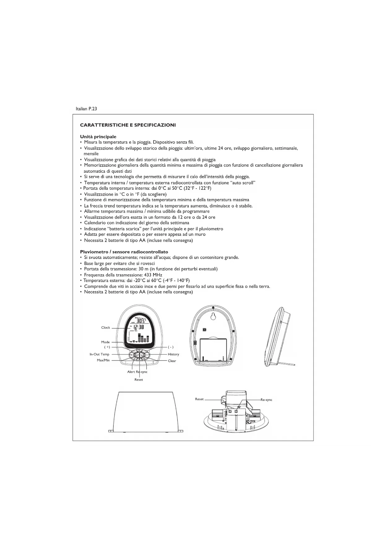 Se la temperatura esterna e la quantità della pioggia sono sempre state indicate dello schermo e se adesso appeare "—C" o —mm", po darsi che la sinceronizzazione sia stata persa. In quello caso bisogna schiacciare il tasto RE-SYNC sull'unità principale ed il tasto RE-SYNC all'interno del pluviometro, dopo di che l'unità principale per se minuti perché il segnale radiotrasmesso dal pluviometro. In quel momento la connessione è di nuovo stabilita.