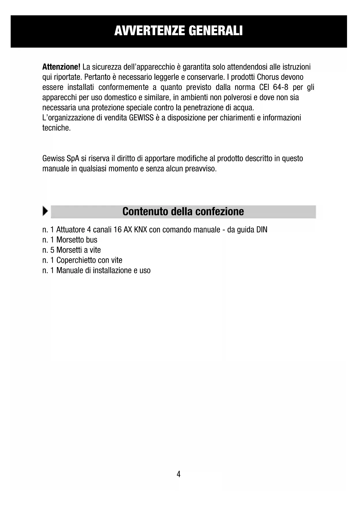 Attenzione! La sicurezza dell'apparecchio è garantita solo attendendosi alle istruzioni qui riportate. Pertanto è necessario leggerle e conservarle. I prodotti Chorus devono essere installati conformmente a quanto previsto alla norma CEI 64-8 per gli apparecchi per uso domestico e similare, in ambienti non polverosi e dove non sia necessaria una protezione speciale contro la penetrazione di acqua. L'organizzazione di vendita GEWISS è a disposizione per chiarimenti e informazioni tecniche.
